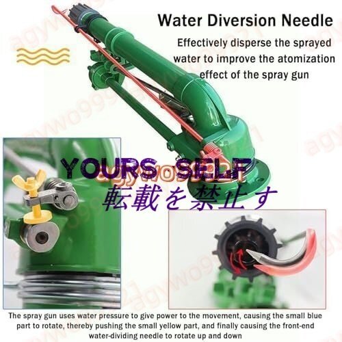 【調整可能な設計】噴霧方向と距離は0~360°の均一回転で調整可能。優れた噴霧効果を発揮し、小さなノズルから霧状の水が芝生に均一かつ正確に噴霧されるため、節水効果も抜群です。 【広範囲噴霧】全自動低速回転式機械装置、ノンブロッキングDCトランスミッション設計、金