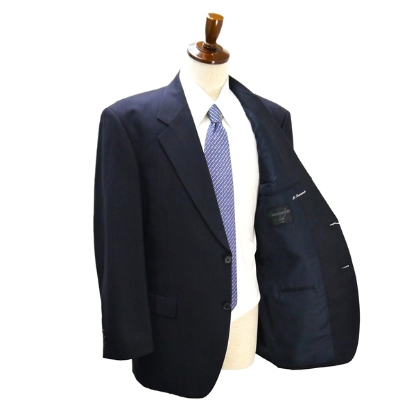 ・春秋冬対応。2つボタンシングル。総裏地仕上げ。ノーベント。フラップポケット。ネーム刺繍あり。開き見せ。