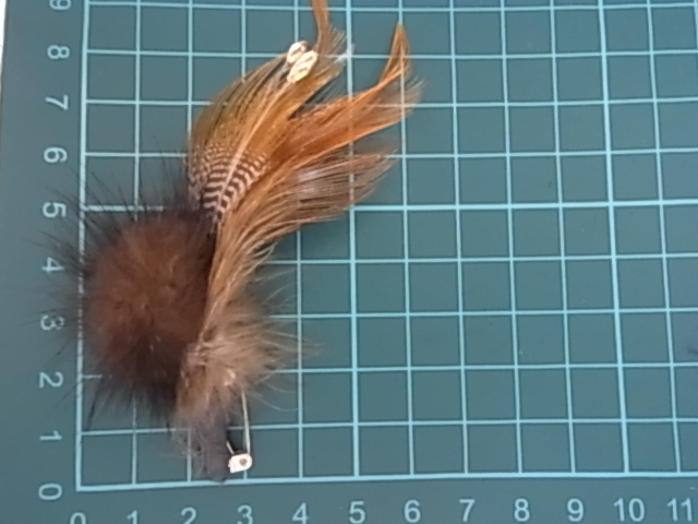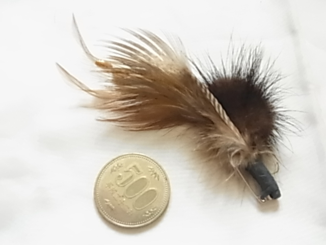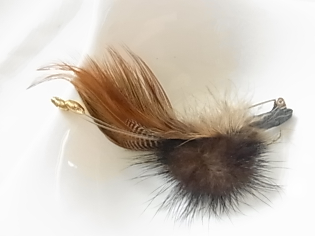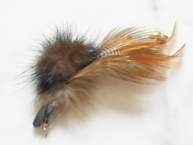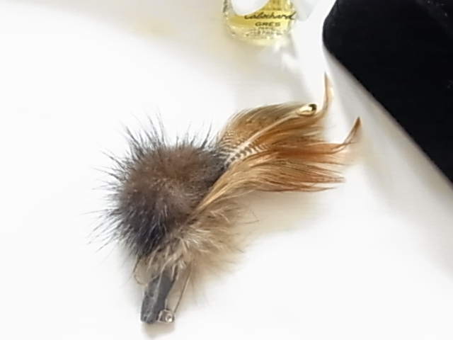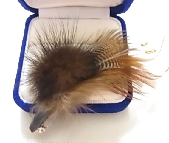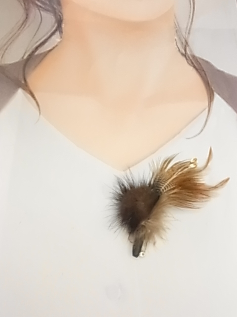 ビンテージ/ヴィンテージ ファー 鳥の羽?素材品質不明 ゴールドトーンの装飾付き レトロの素敵なブローチ♪♪