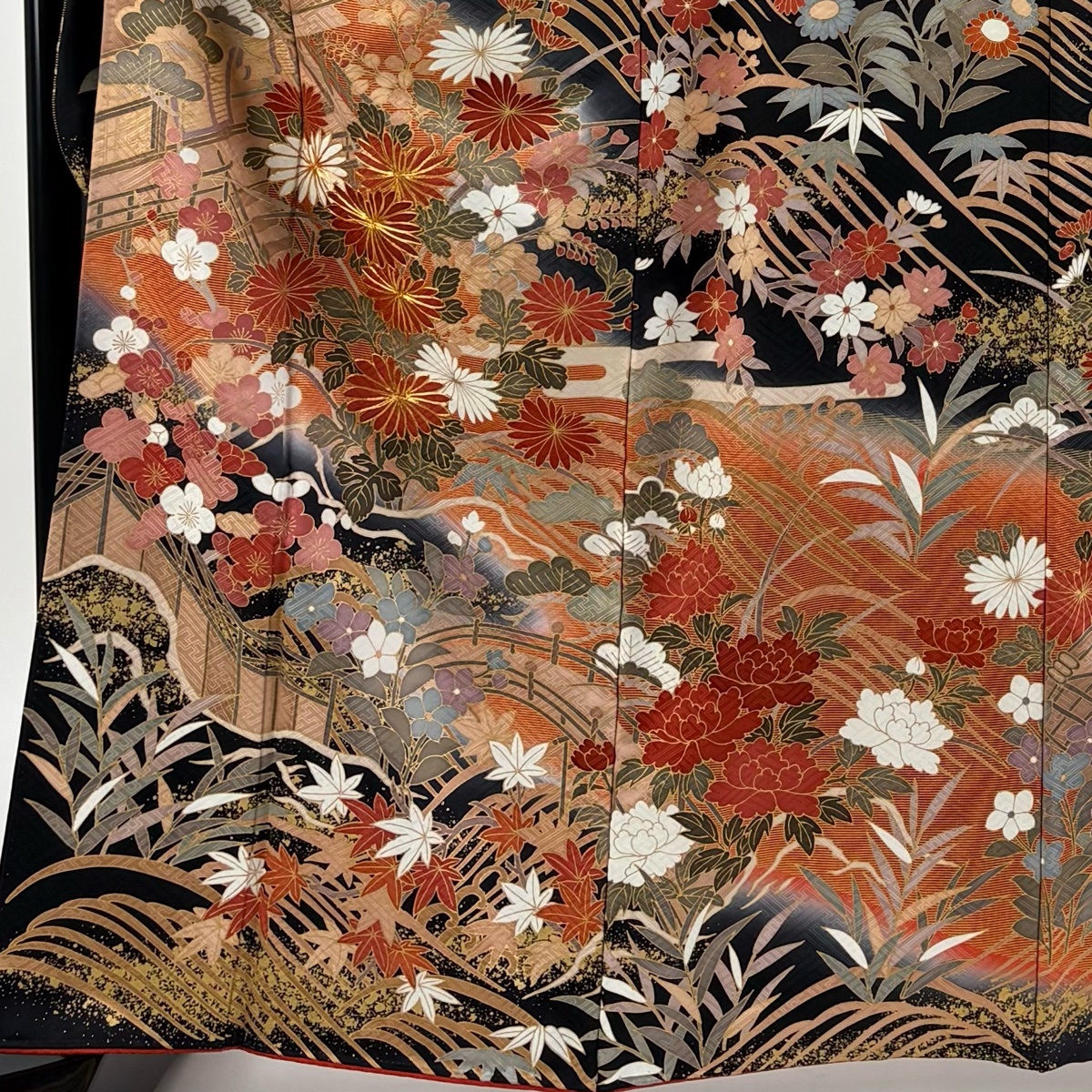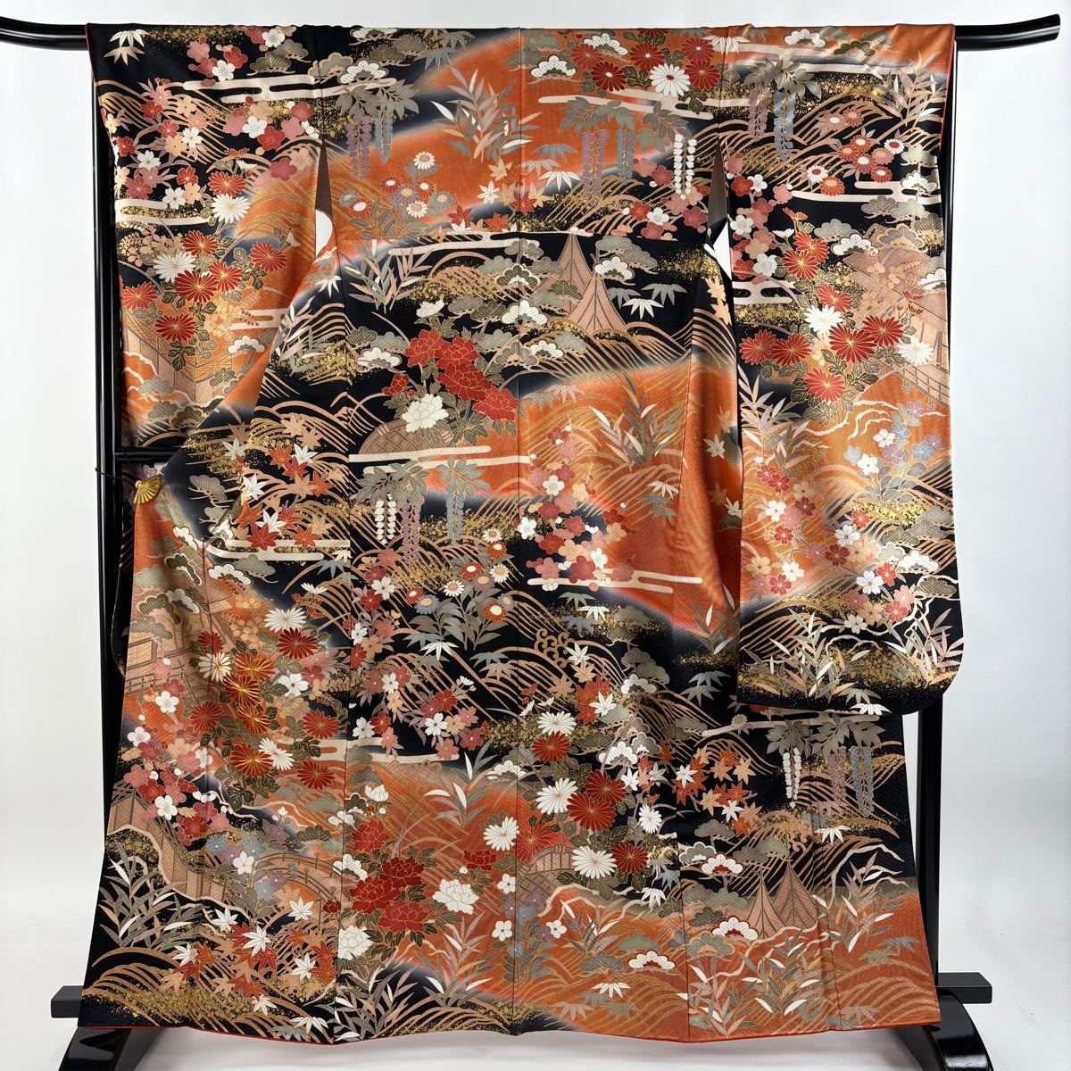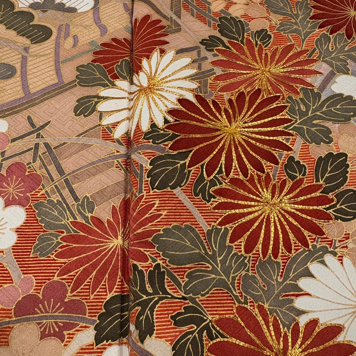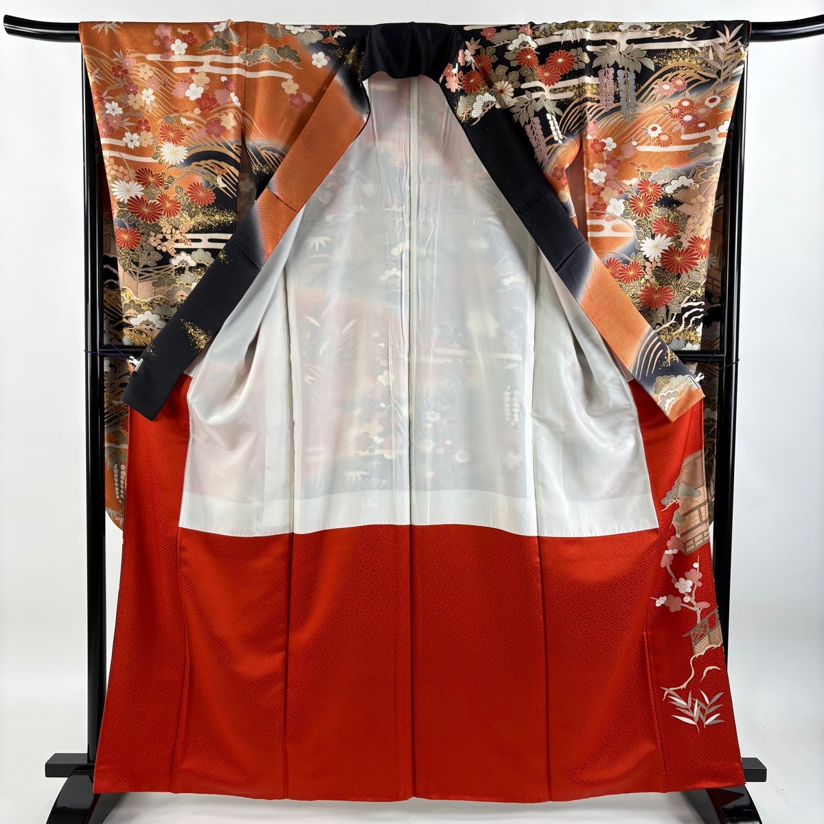 | 振袖 秀品 建物 松竹梅 金彩 金糸 朱色 袷 身丈164 裄丈66.5 M 正絹 【中古】 |