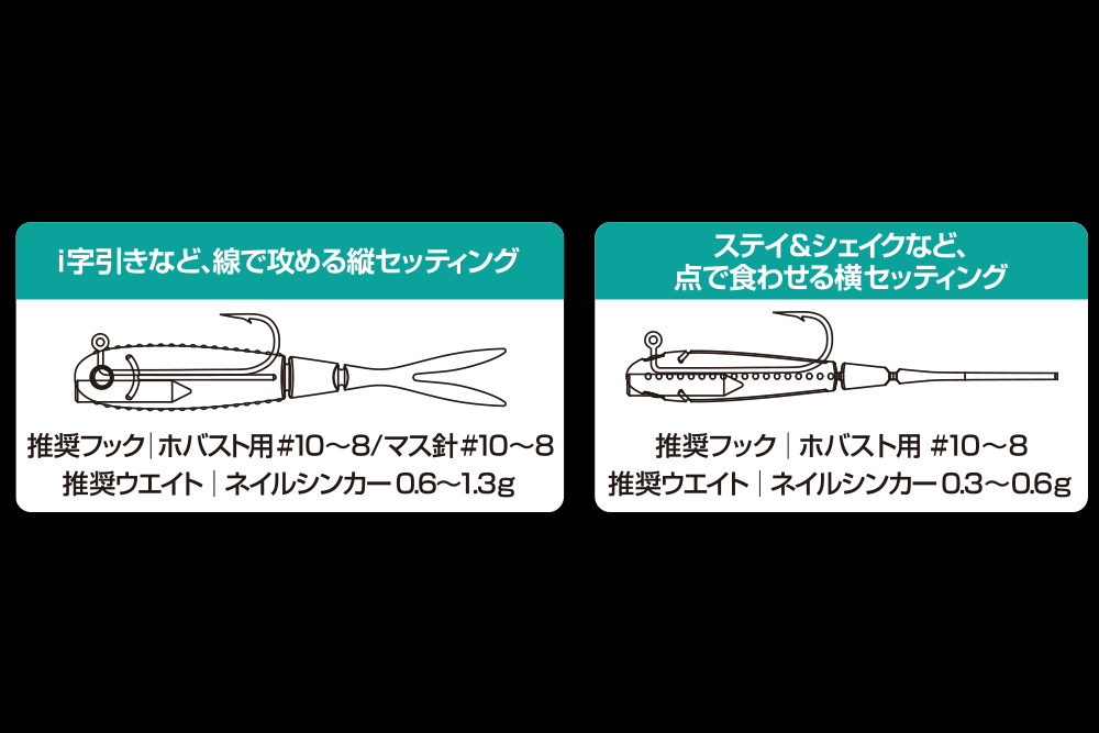 通常のセッティング(縦刺し)でも偏平面が上下となる横刺しでも使用可能なデザイン。安定したi字引きと逃しアクションに特化した縦刺し。スローな誘いで繊細にアクションさせる横刺し。状況に応じての使い分けが可能となる。