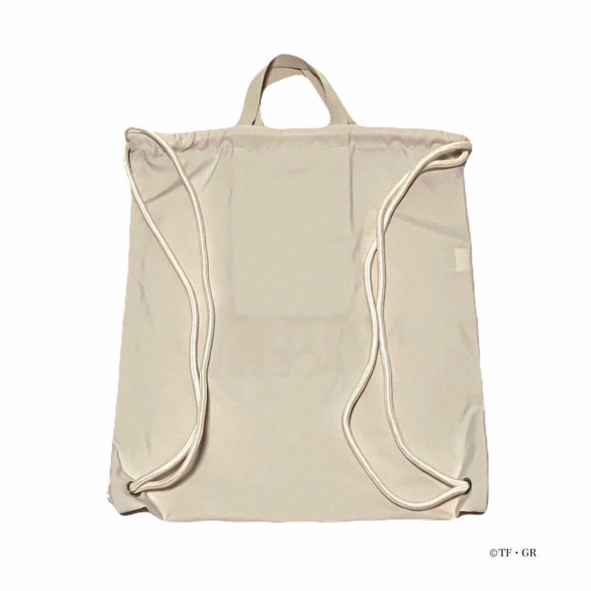 ・適度な太さの紐で簡単に締めるタイプのナップザックで、吊り下げや持ち運びに便利な持ち手付きです。