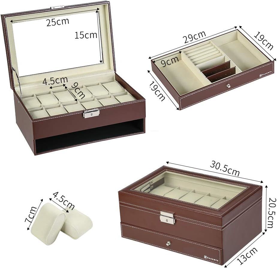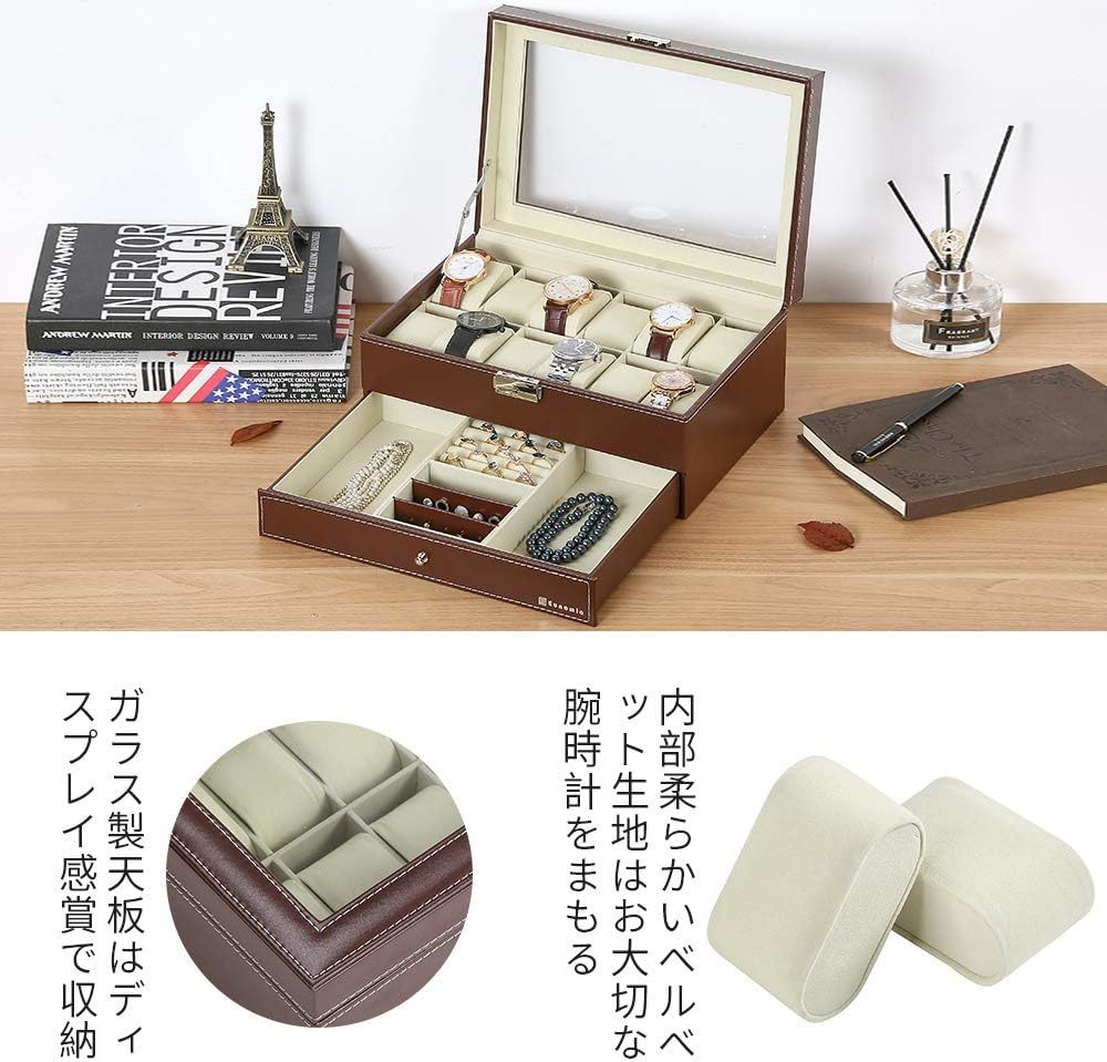 12個の腕時計スロットに加え、指輪箱やピアスカード、他の仕切りも備えており、さまざまなジュエリーやアクセサリーを収納することができます。また、ガラス張りの天板により、腕時計のディスプレイやコレクションとしても楽しむことができます。