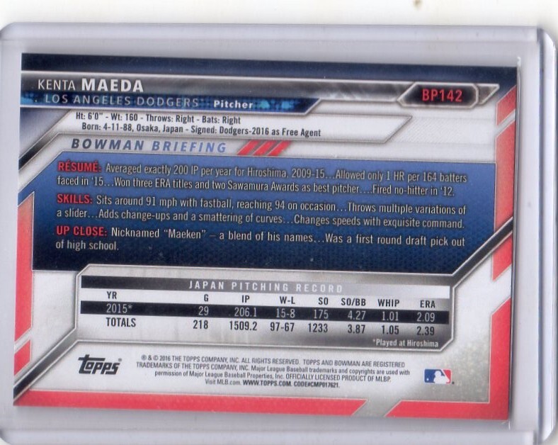 2016BOWMAN PROSPECTS #BP142 1ST BOWMAN 前田健太 MLBルーキー・カード 前田健太ファンの方、是非どうぞ! |