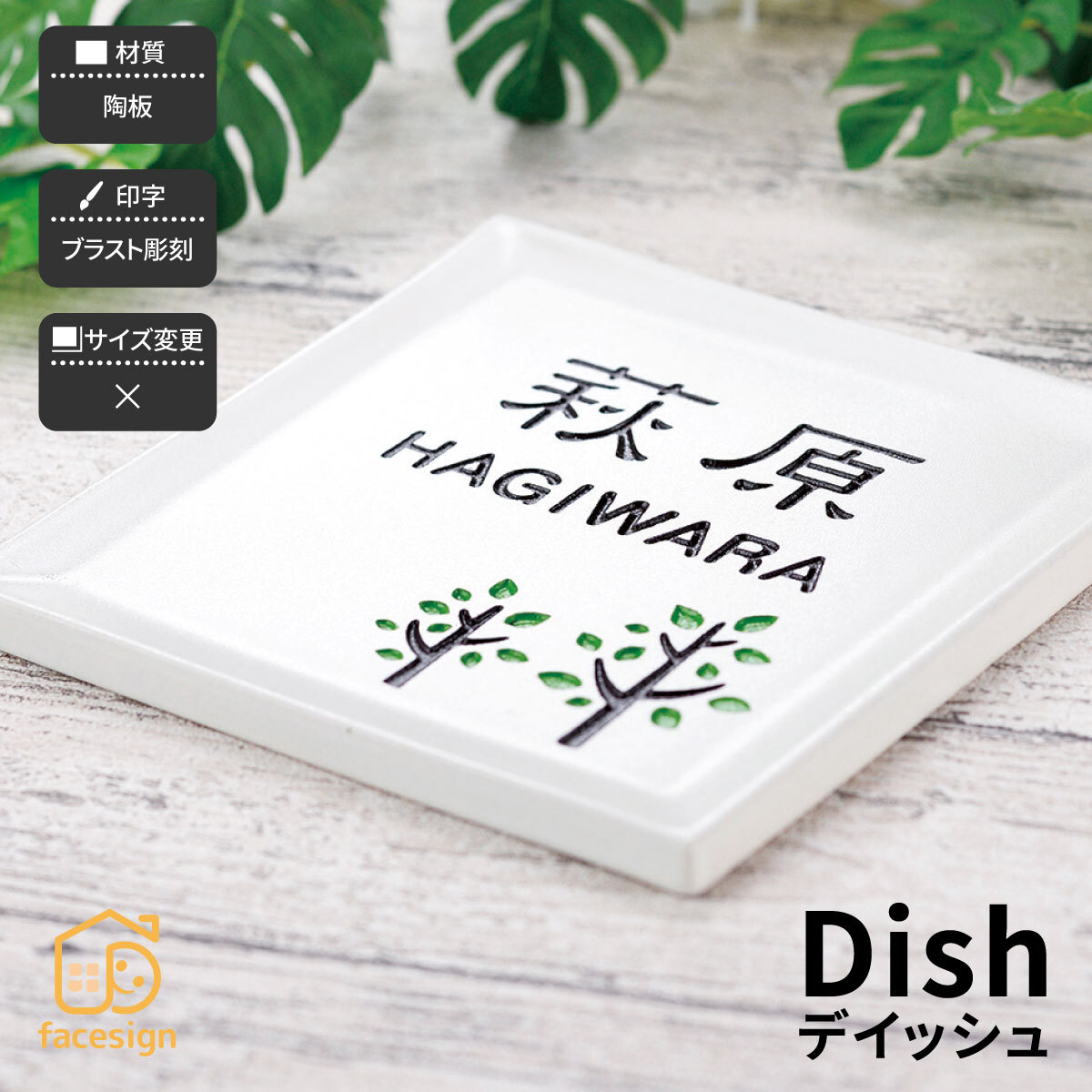 商品詳細 | 四角いお皿のような形状が可愛らしく、とても扱いやすいサイズ感の陶板表札。機能門柱など限られたスペースに最適です。 |