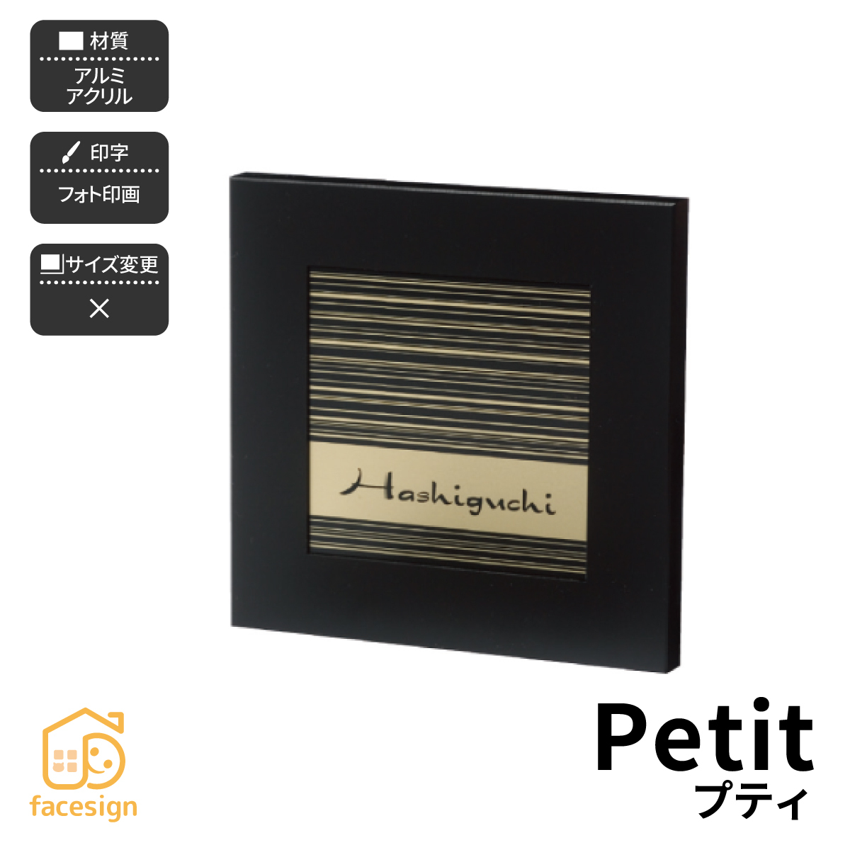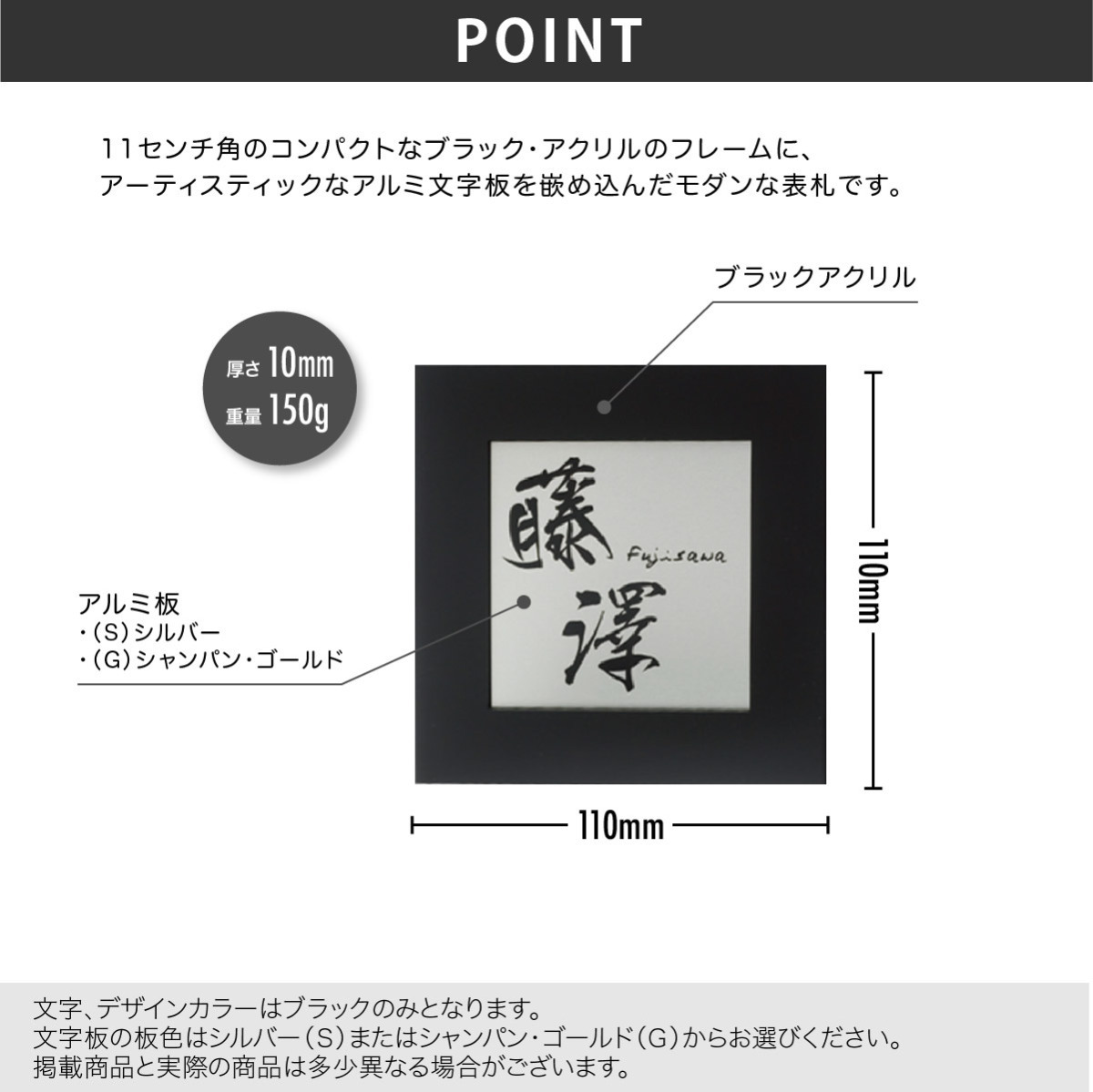 商品詳細 | 11センチ角のコンパクトなブラック・アクリルのフレームに、アーティックなアルミ文字板を嵌め込んだモダンな表札です。 文字板の板色はシルバーまたはシャンパン・ゴールドからお選びいただけます。 文字、デザインカラーはブラックのみとなります。 |