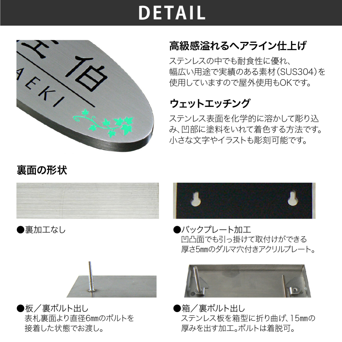 商品詳細 | ステンレスの中でも耐食性に優れ、幅広い用途で実績のある素材(SUS304)を使用していますので屋外使用もOKです。ウェットエッチングとはステンレス表面を化学的に溶かして彫り込み、凹部に塗料をいれて着色する方法です。 |