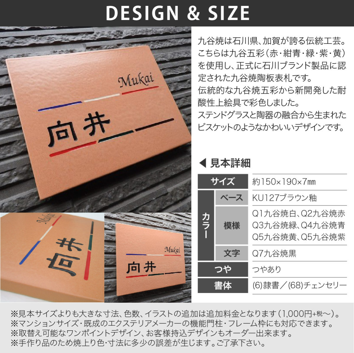 | 商品詳細 | 九谷焼は石川県、加賀が誇る伝統工芸。こちらは九谷五彩(赤・紺青・緑・紫・黄)を使用し、正式に石川ブランド製品に認定された九谷焼陶板表札です。伝統的な九谷焼五彩から新開発した耐酸性上絵具で彩色しました。ステンドグラスと陶器の融合から生まれたビスケットのようなかわいいデザインです。 |