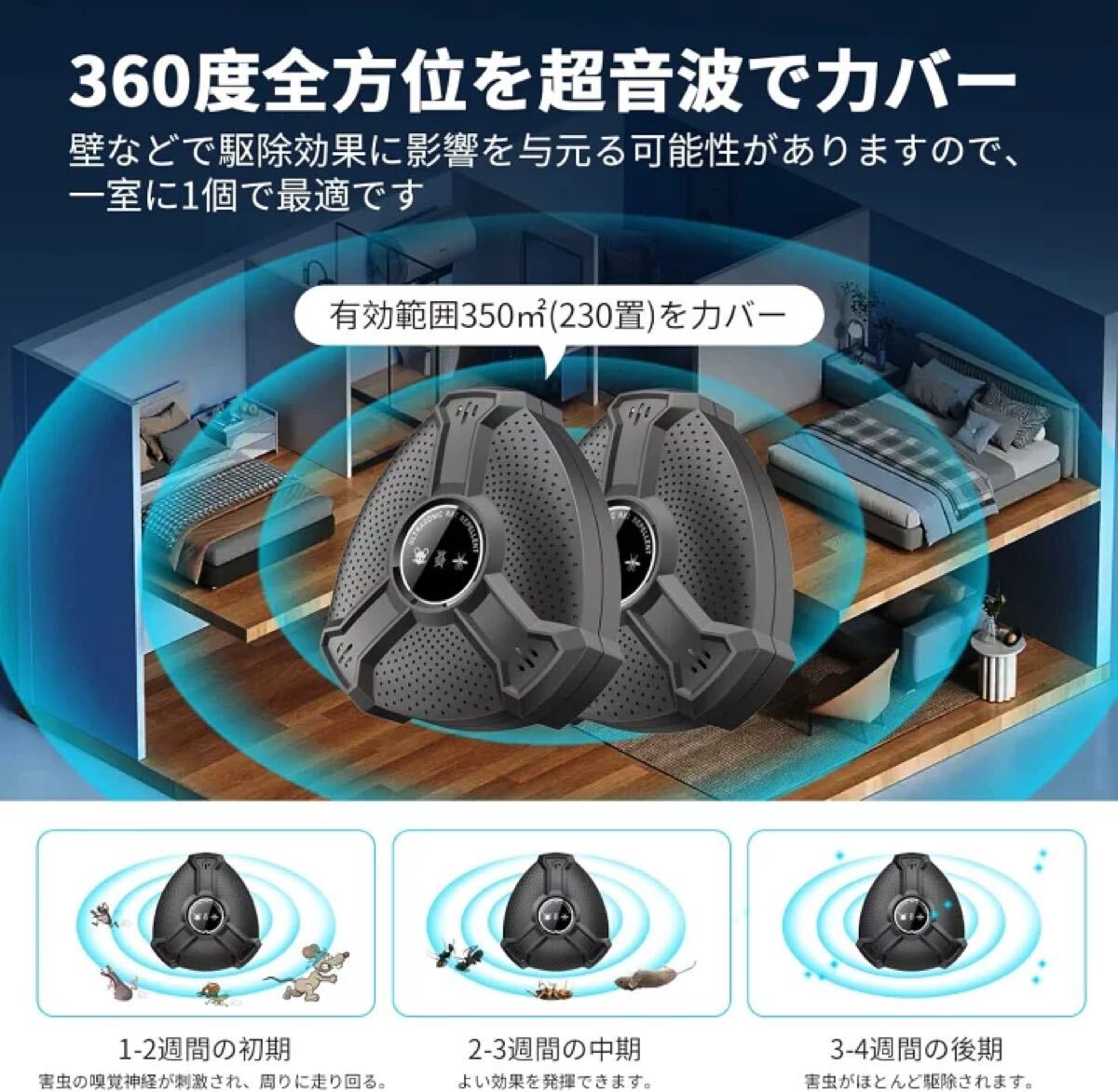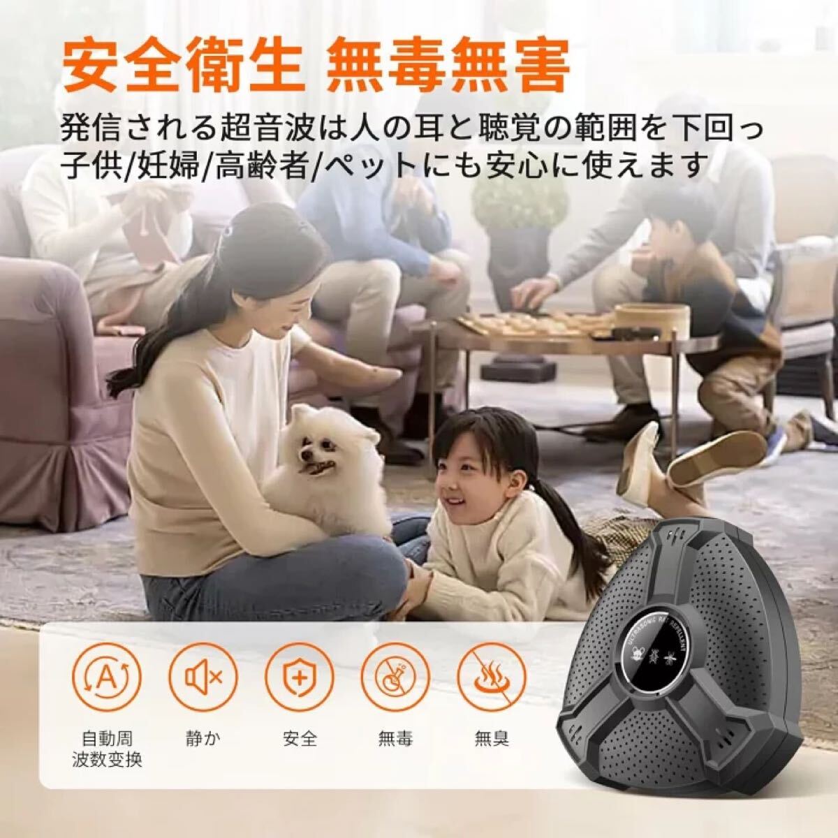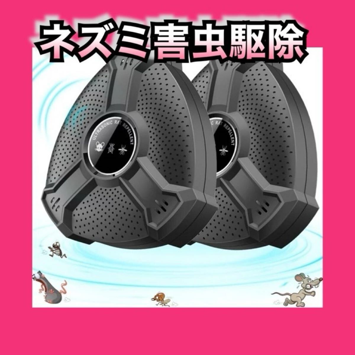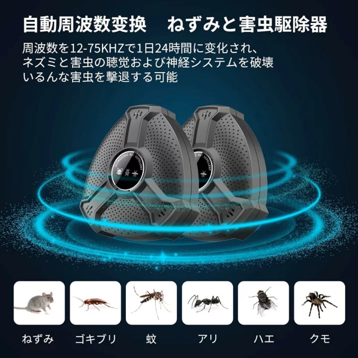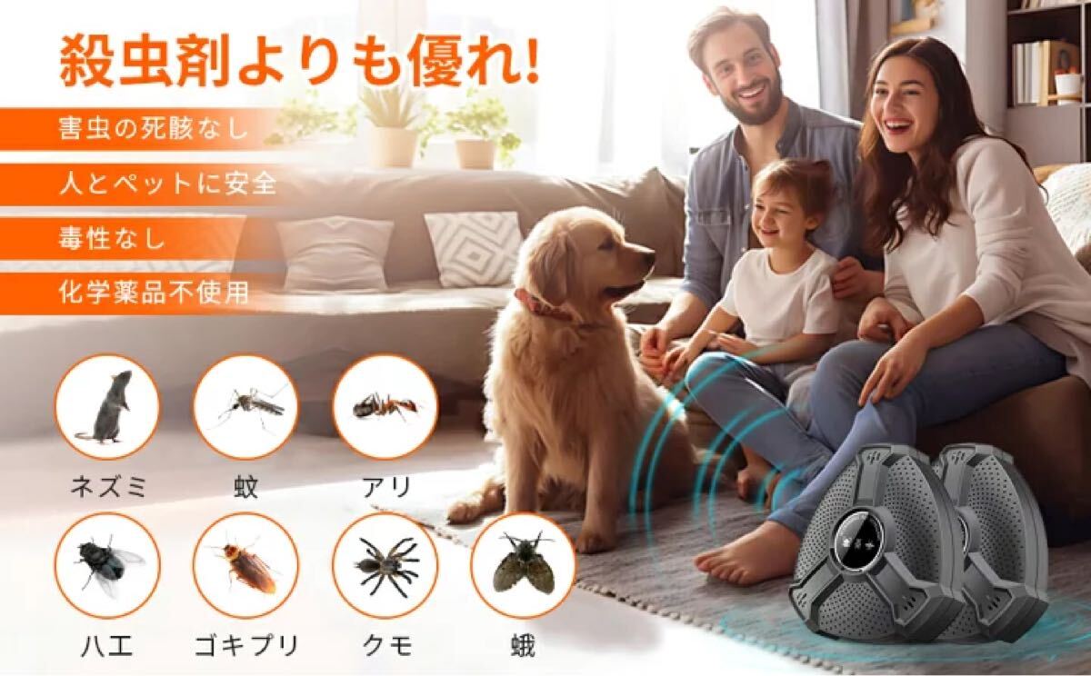 【2】「安全安心 無毒無臭 静か」本製品は超音波によってネズミを撃退するため、退避剤、毒餌、粘着シート、化学薬品は使用しないので環境や身体にも安心・安全。刺激臭もなく、発信される超音波は害虫にだけ効果があり、子供、妊娠中、ペットには悪影響を与えません。ノイズがなく、睡眠中にも利用できます。鼠/ねずみ/マウス、ゴキブリ、蚊、虫、アリ、ノミ、ハエ、ダニ、シロアリ、ハチ、クモ、コウモリなどの多種類の動物対応できます。