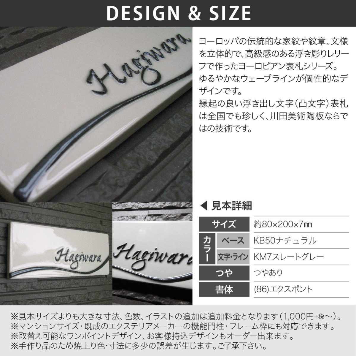 商品詳細 | ヨーロッパの伝統的な家紋や紋章、文様を立体的で、高級感のある浮き彫りレリーフで作ったヨーロピアン表札シリーズ。ゆるやかなウェーブラインが個性的なデザインです。縁起の良い浮き出し文字(凸文字)表札は全国でも珍しく、川田美術陶板ならではの技術です。 |