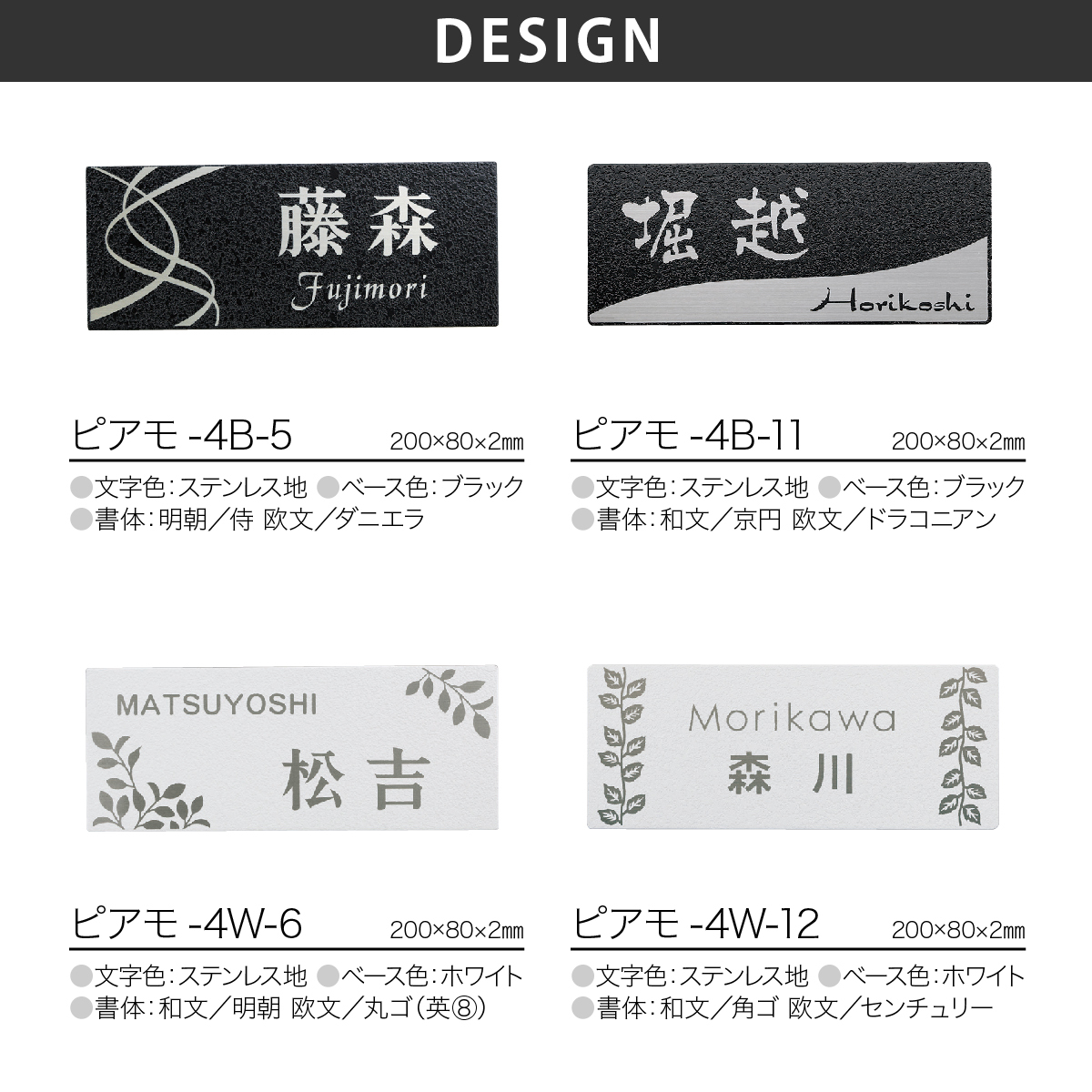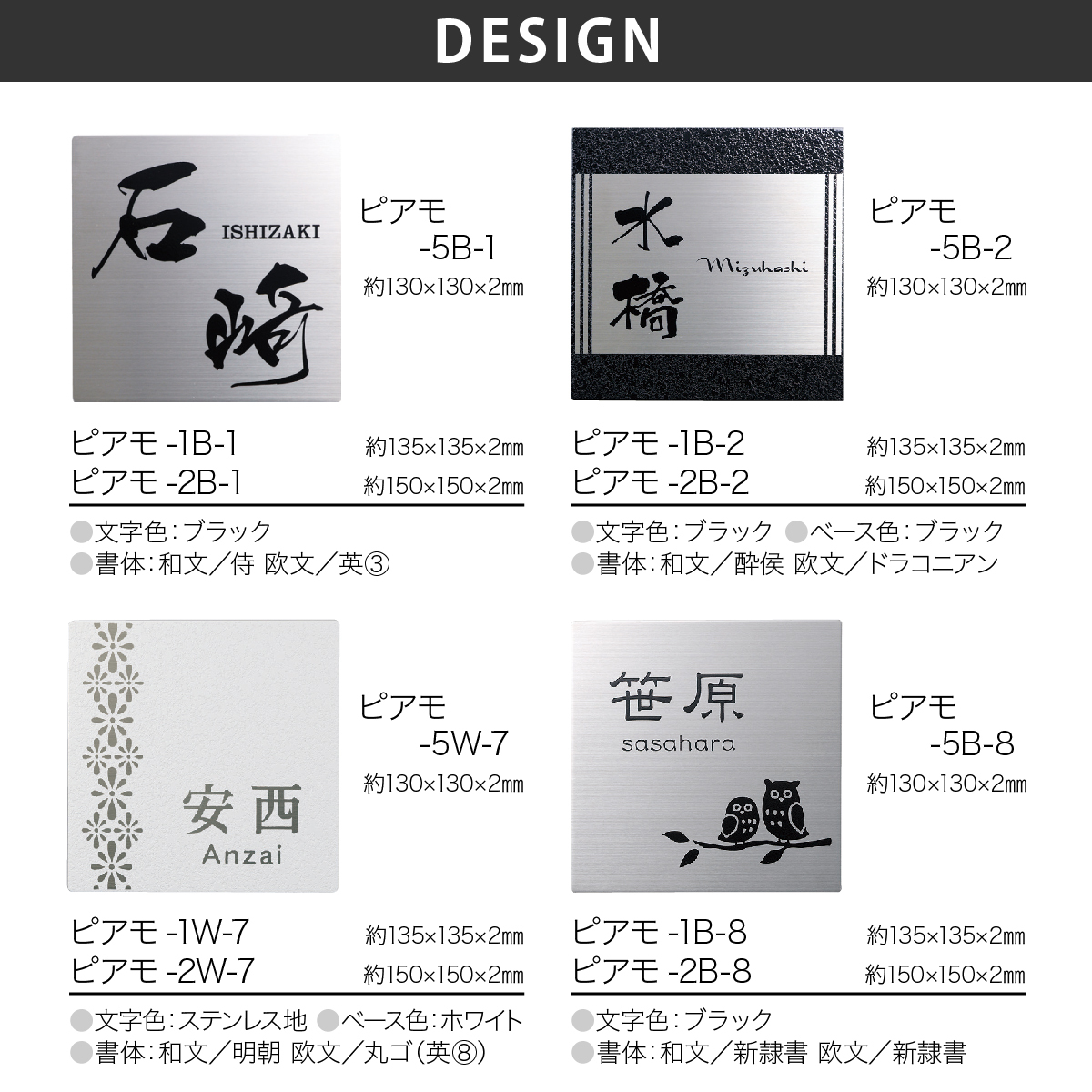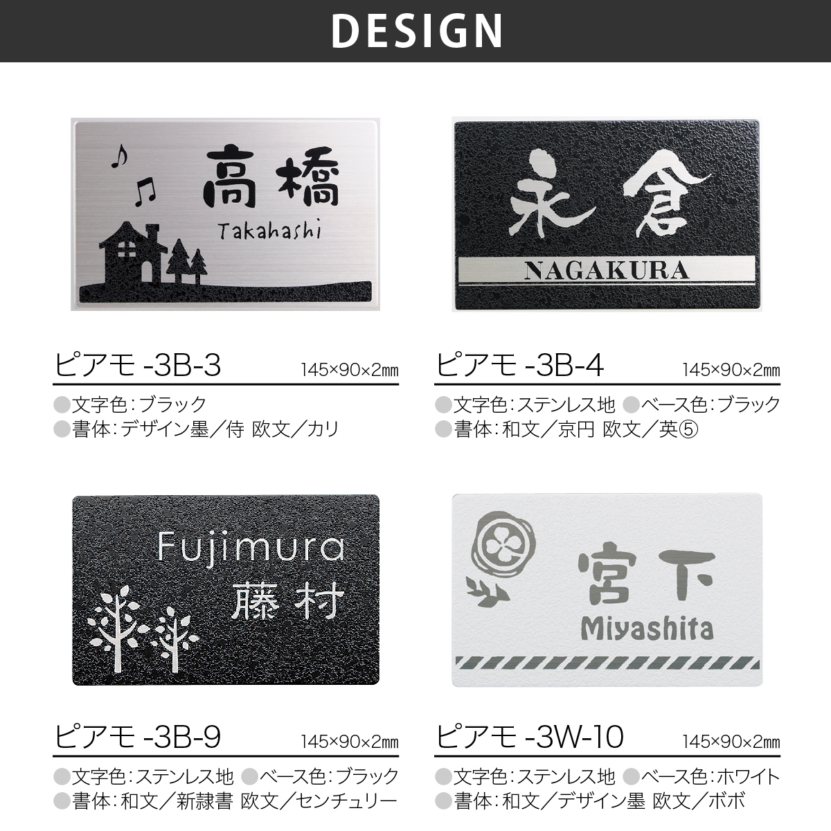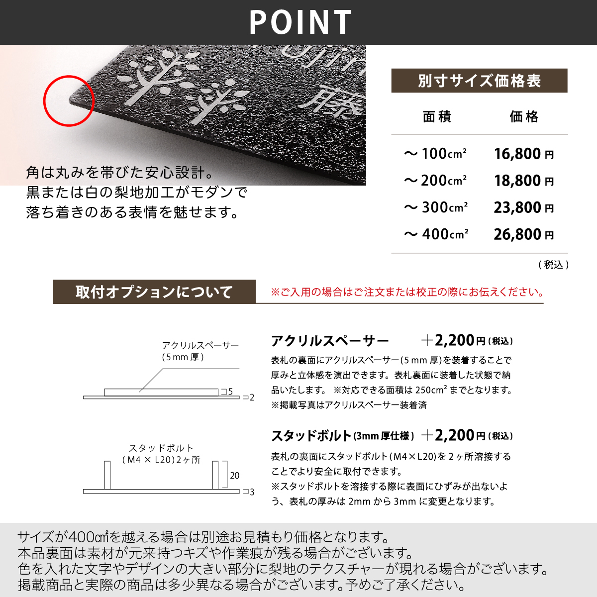 | 商品詳細 | ステンレス2mm厚のフリーサイズ対応表札です。 黒、白、シルバーステンレスのほかに、梨地加工もございます。 梨地加工ステンレスはモダンで落ち着きがあり人気の表札です。 4角にR加工を施した安心設計なので、スペーサーオプションで立体感のある取付けもおすすめです。 ブラック部分をシルバーに変更など、各レイアウトの色を反転することも可能です。 |