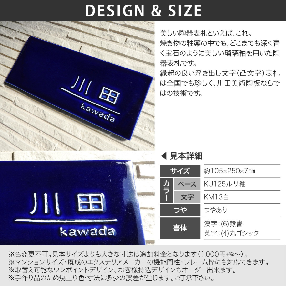 | 商品詳細 | 美しい陶器表札といえば、これ。焼き物の釉薬の中でも、どこまでも深く青く宝石のように美しい瑠璃釉を用いた陶器表札です。縁起の良い浮き出し文字(凸文字)表札は全国でも珍しく、川田美術陶板ならではの技術です。 |