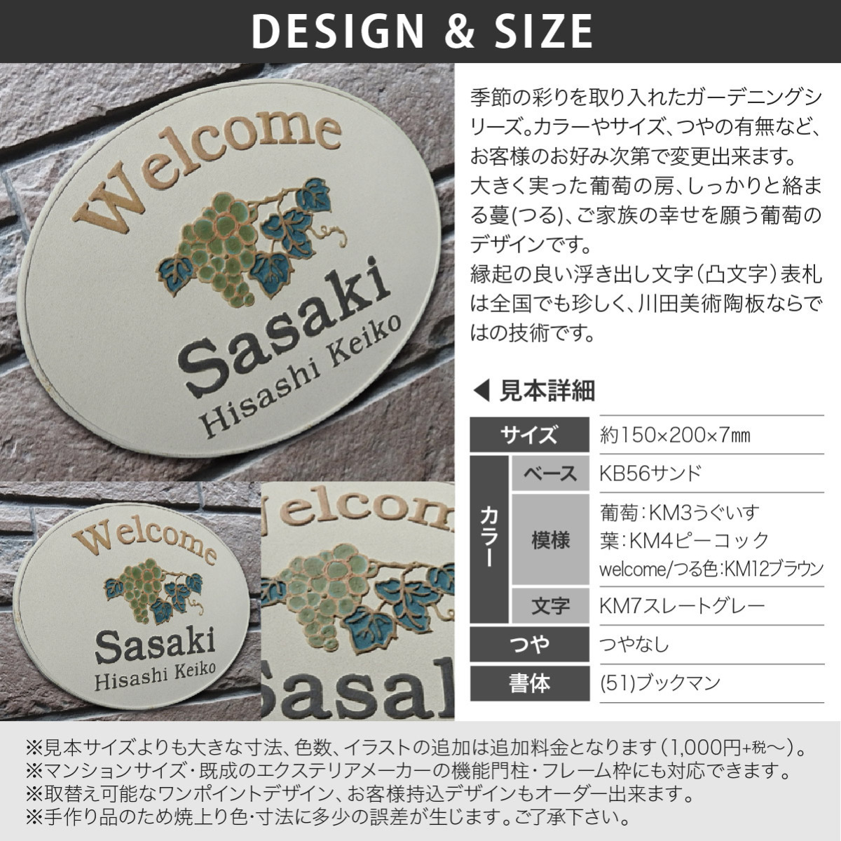 | 商品詳細 | 季節の彩りを取り入れたガーデニングシリーズ。カラーやサイズ、つやの有無など、お客様のお好み次第で変更出来ます。大きく実った葡萄の房、しっかりと絡まる蔓(つる)、ご家族の幸せを願う葡萄のデザインです。縁起の良い浮き出し文字(凸文字)表札は全国でも珍しく、川田美術陶板ならではの技術です。 |