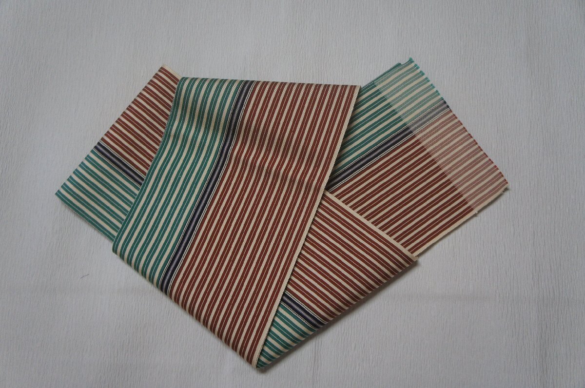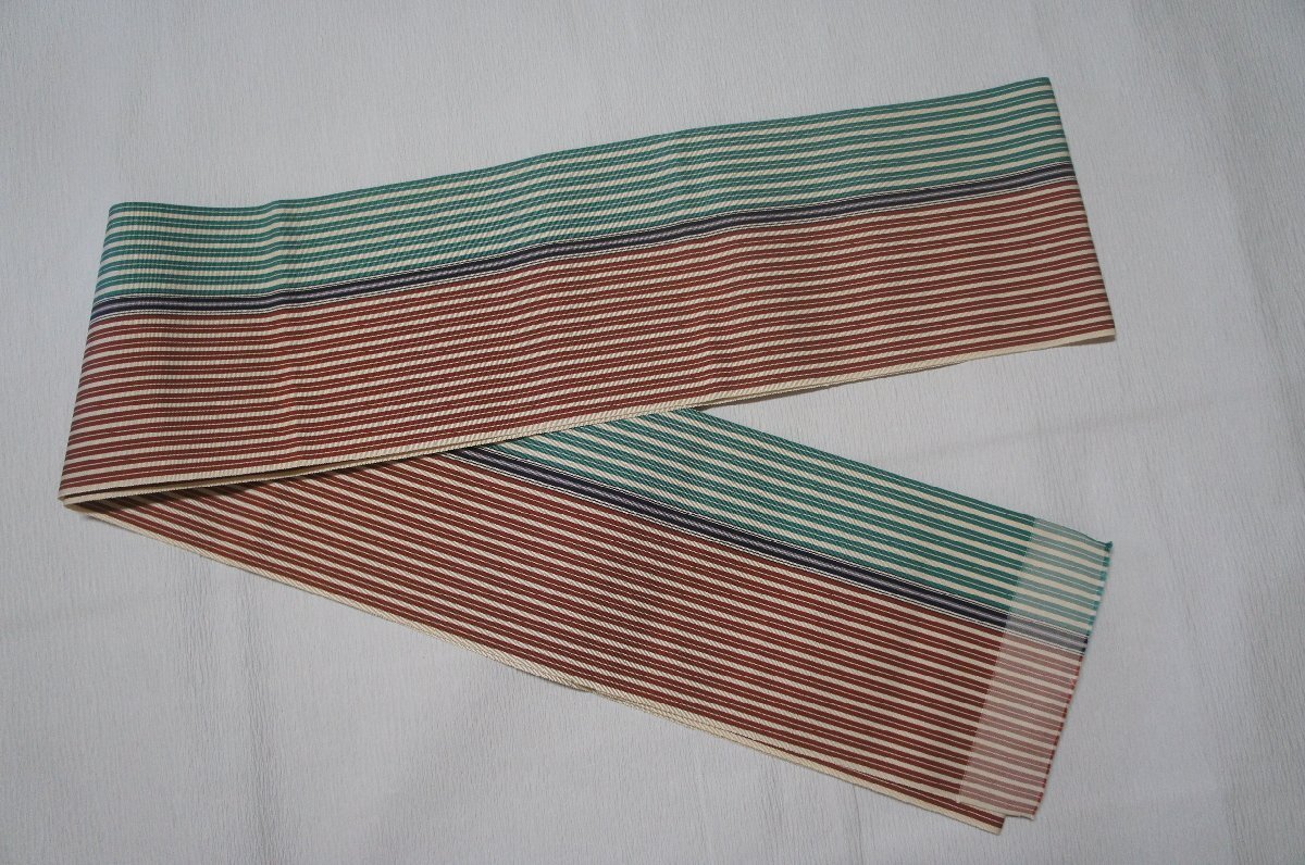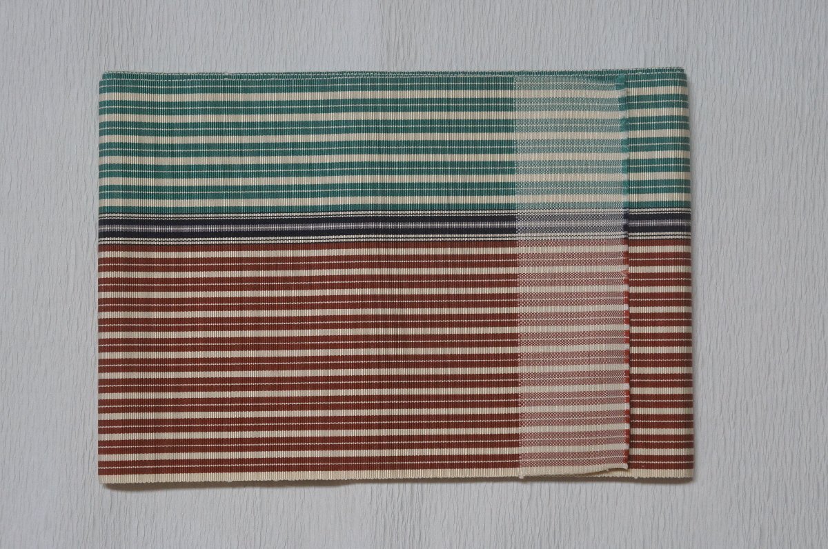 帯柄附全通柄 本筑博多織アイボリー色緑青色茶色グレー色濃紺色地縞模様
