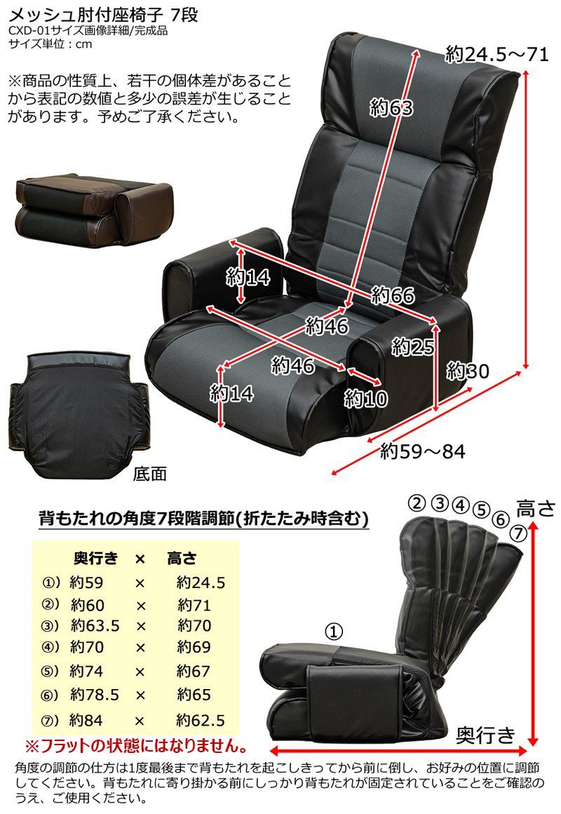 サイズ | (W)幅66×(D)奥行59~84×(H)高24.5~71cm 背もたれの厚み:約11cm 座面の厚み:約13cm |