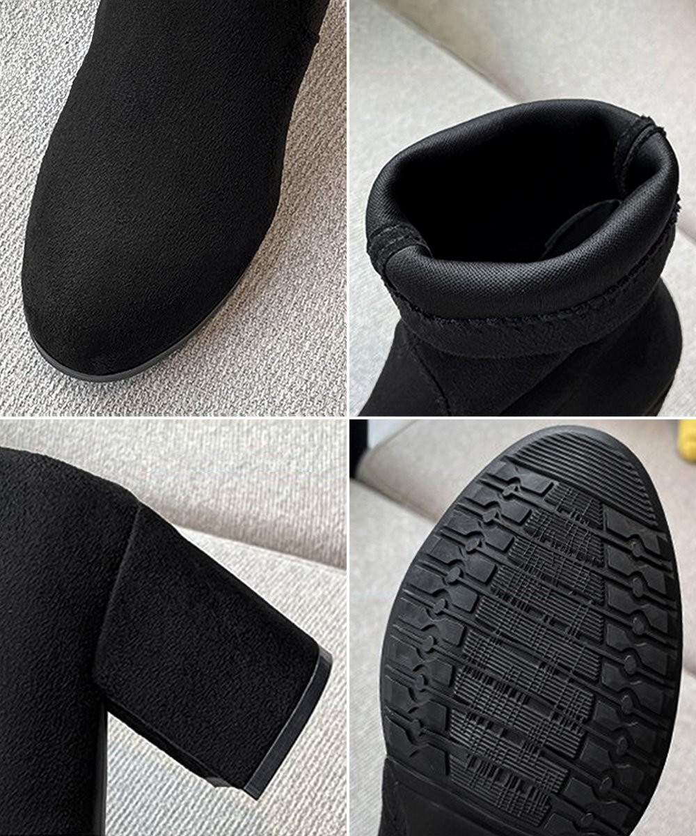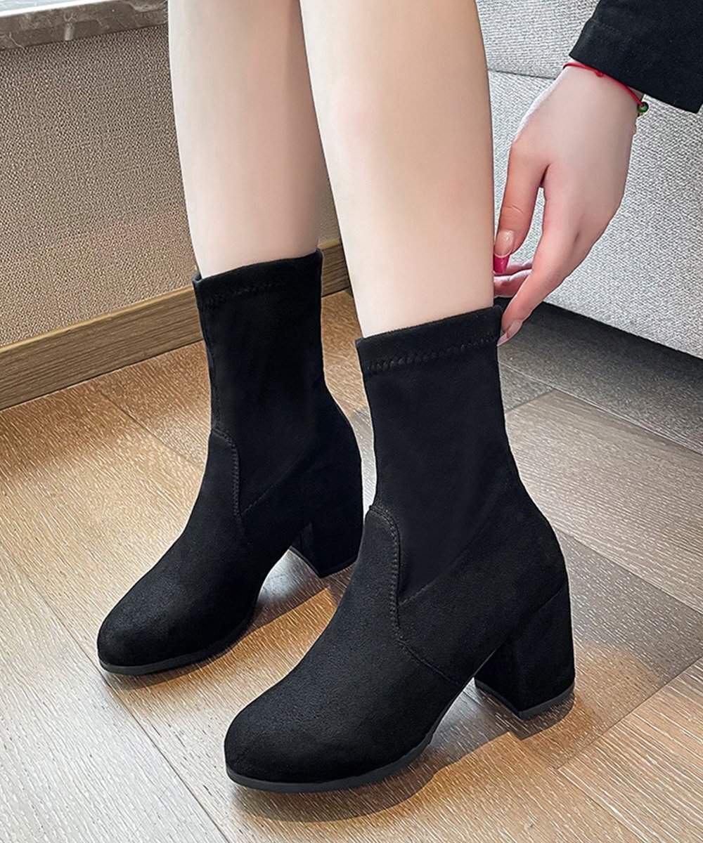 おしゃれ ストレッチブーツ チャンキーヒール レディース 美脚ブーティ ラウンドトゥミドルブーツ 黒 通勤 歩きやすい靴