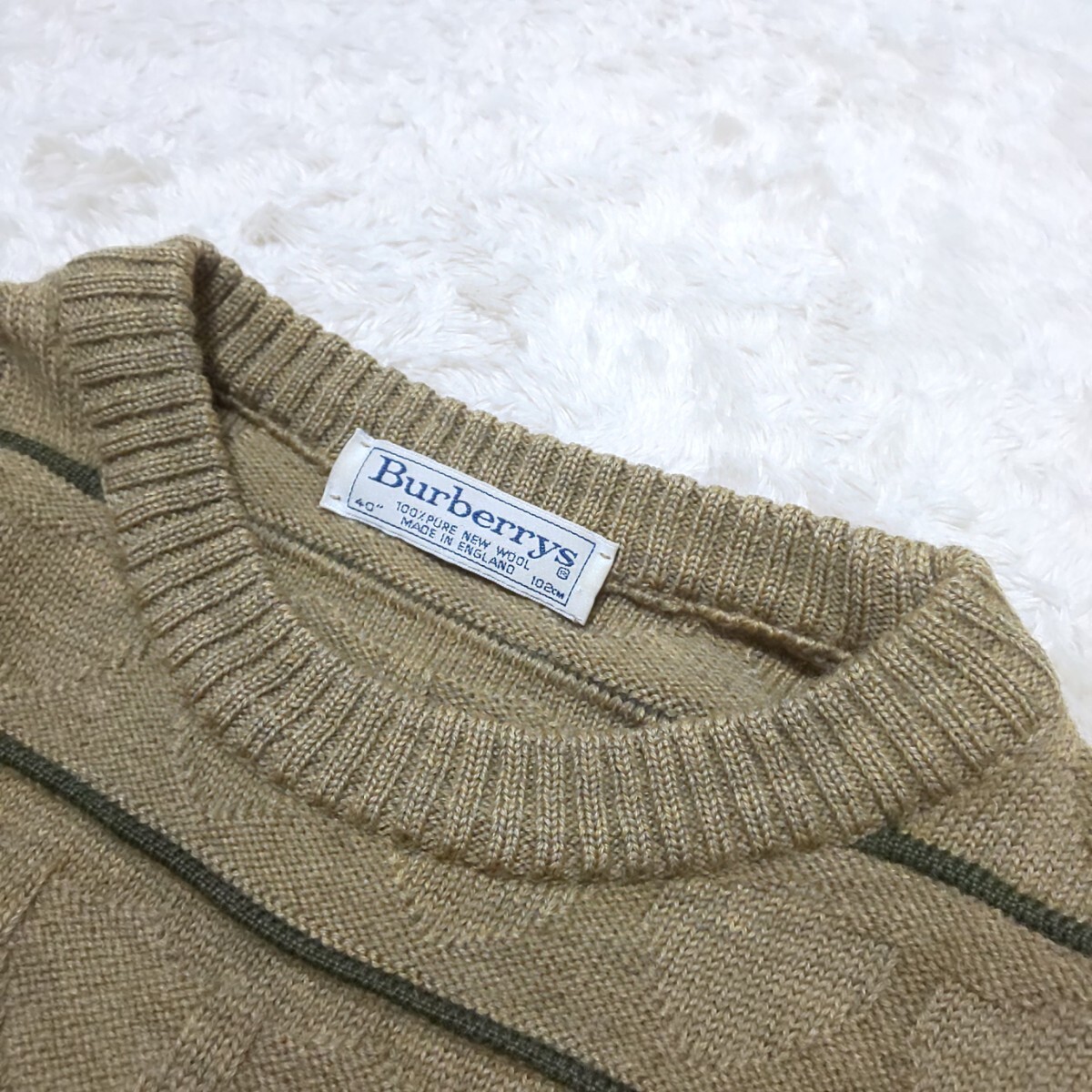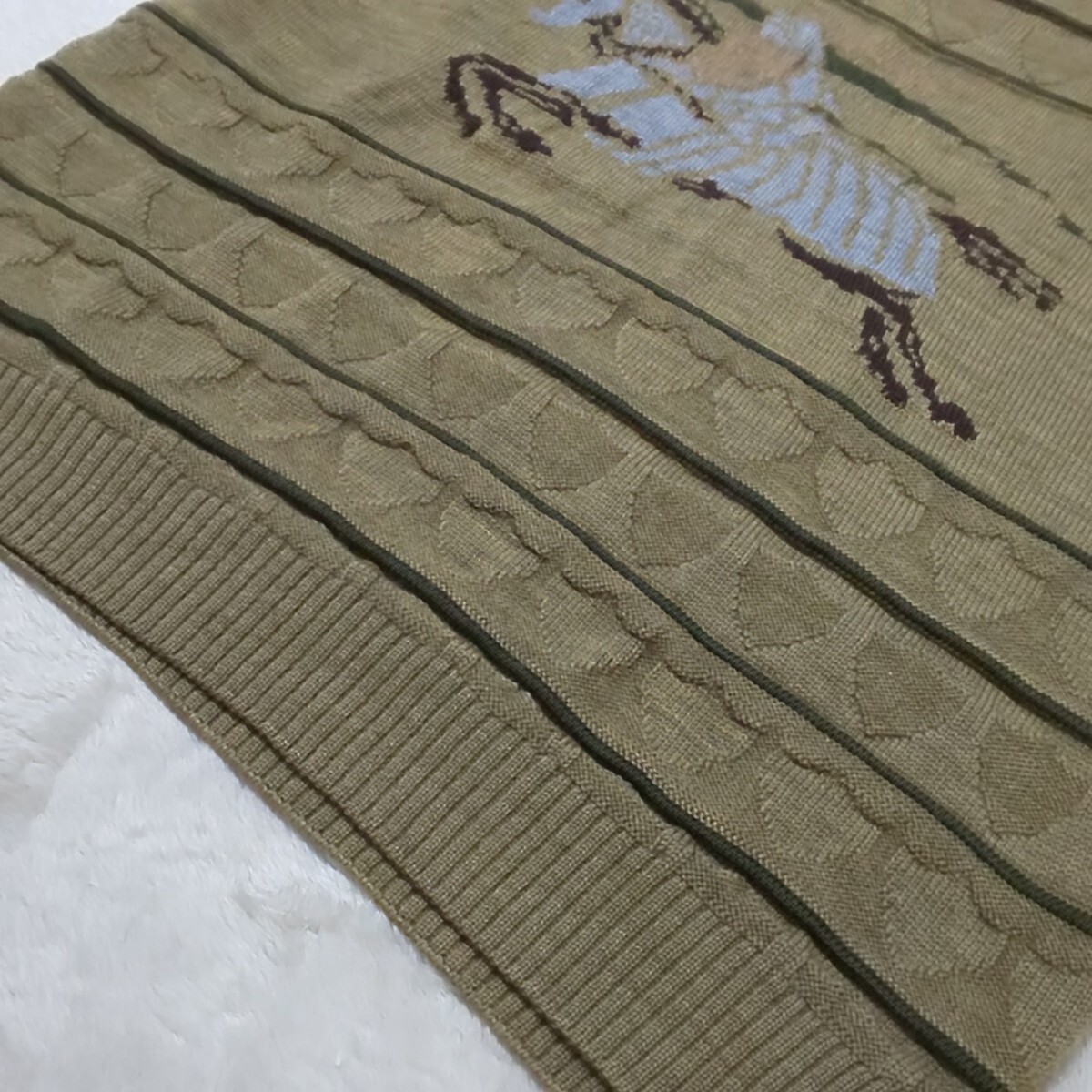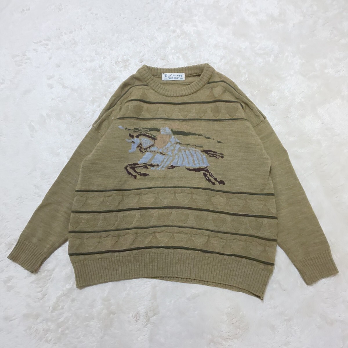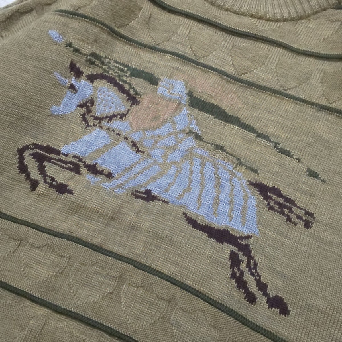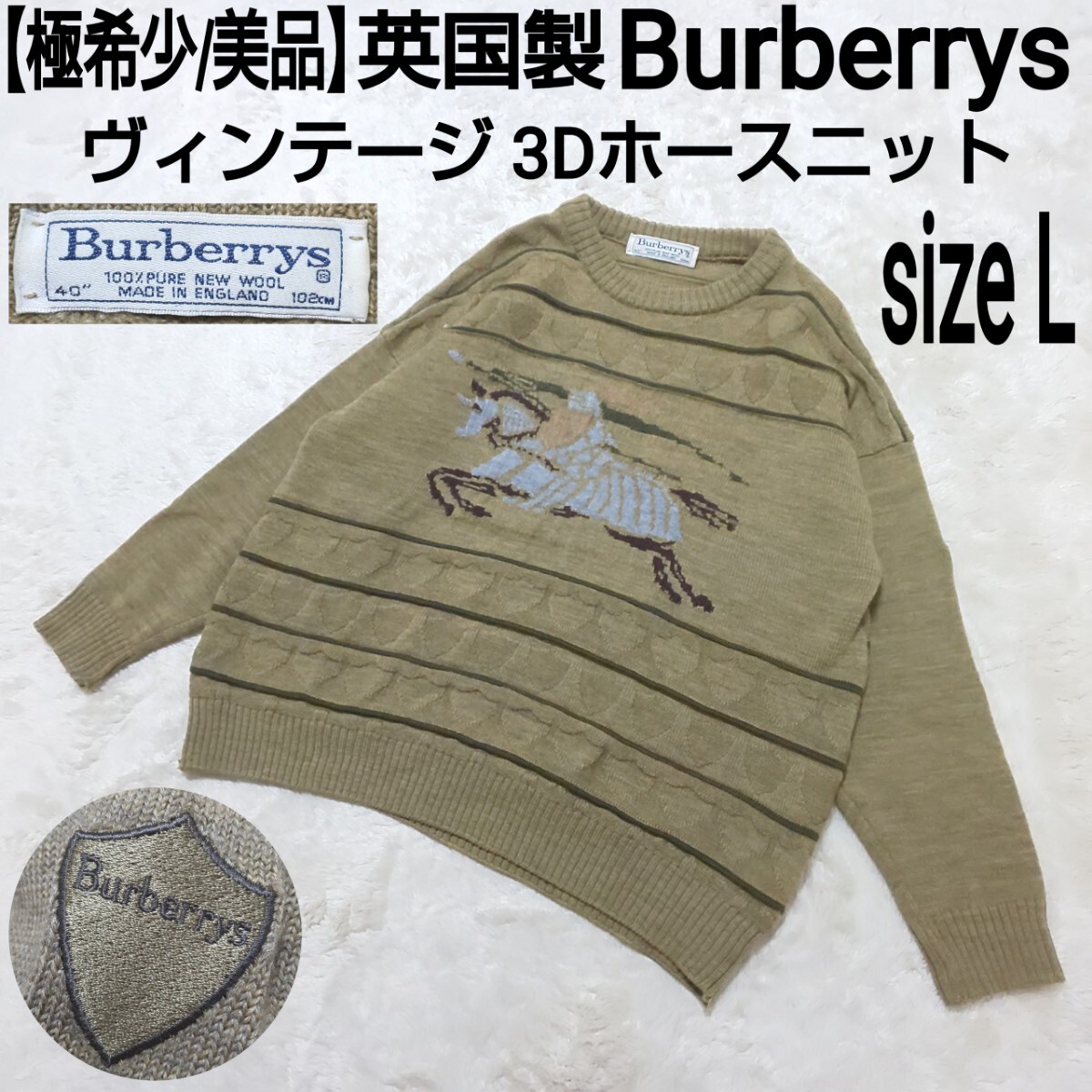 【極希少/美品】英国製 Burberrys バーバリー ヴィンテージ 3Dホースニット セーター エンブレムパッチ 膨れ編み カーキ