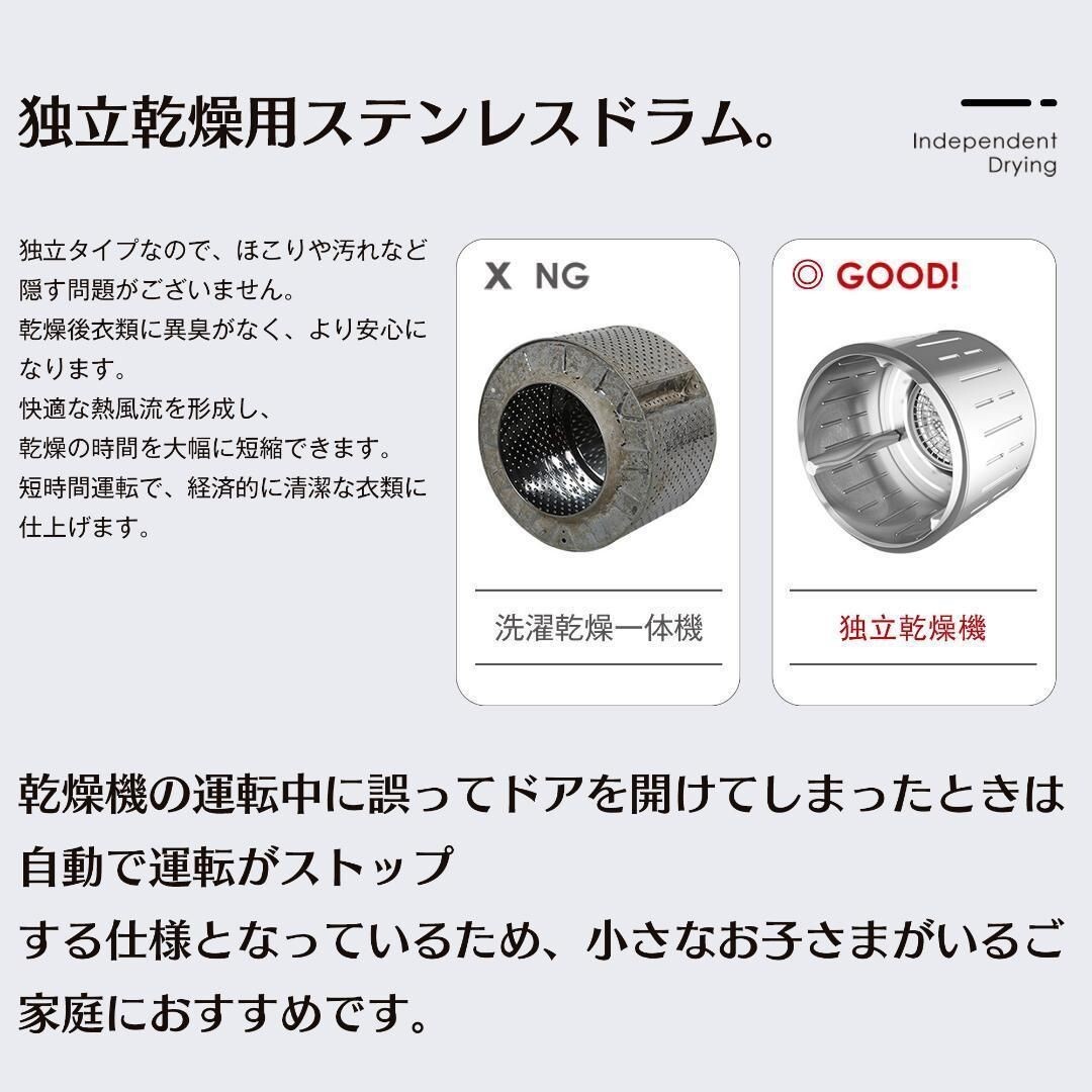 【独立乾燥用ステンレスドラム】独立タイプなので、ほこりや汚れなど隠す問題がございません。乾燥後衣類に異臭がなく、より安心になります。快適な熱風流を形成し、乾燥の時間を大幅に短縮できます。短時間運転で、経済的に清潔な衣類に仕上げます。