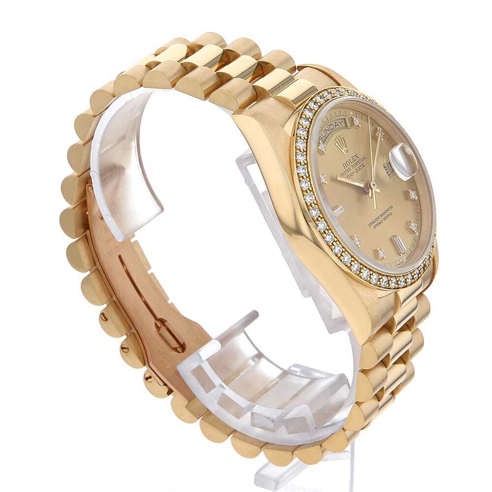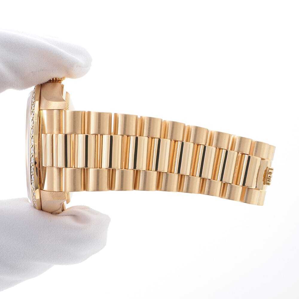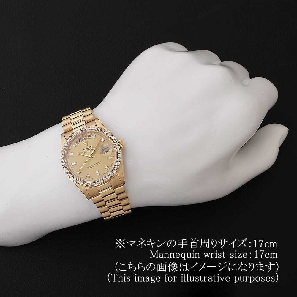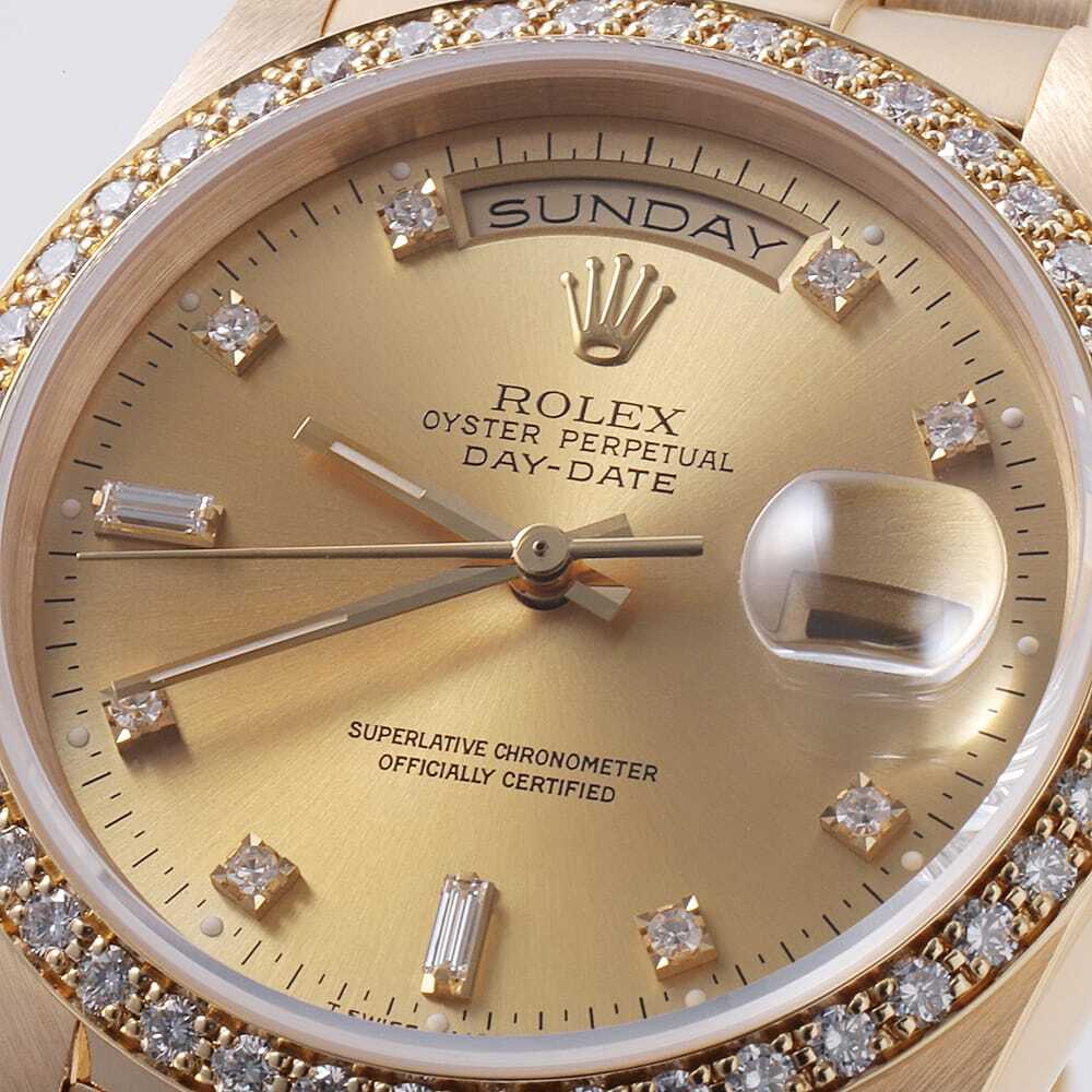 モデル情報 | 1956年の誕生以来、ロレックスの最上級ラインとして最高級の素材と質感にこだわったハイクラスコレクション"デイデイト"。素材はゴールドもしくはプラチナのみを採用しており、唯一フルカレンダーを搭載するモデルです。文字盤のシャンパンゴールドには8Pダイヤ、6時・9時位置にはバゲットダイヤ、さらにはベゼルにもダイヤを装飾した華やかでゴージャスなモデルです。 |