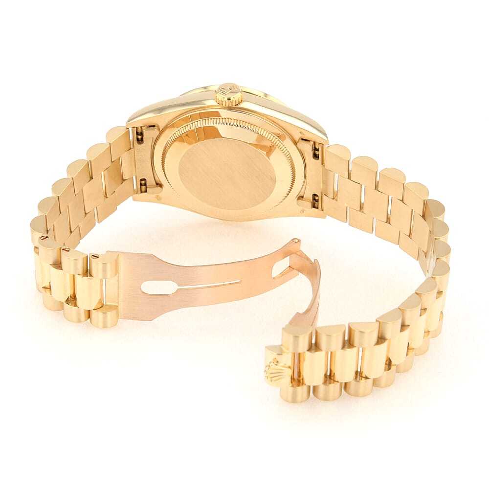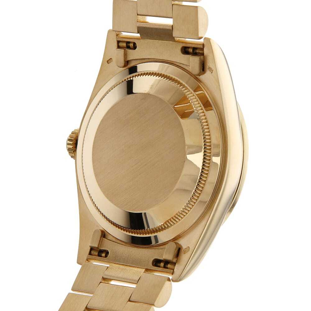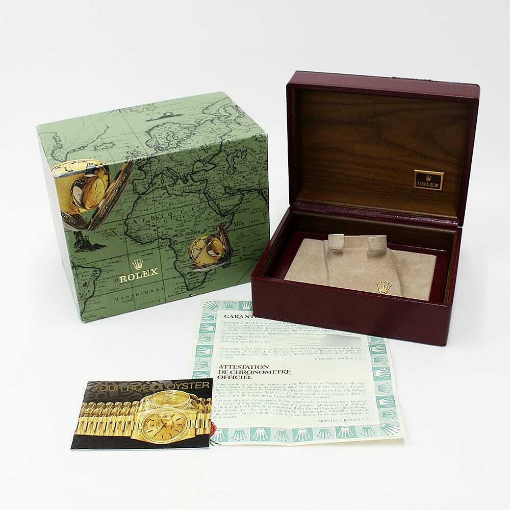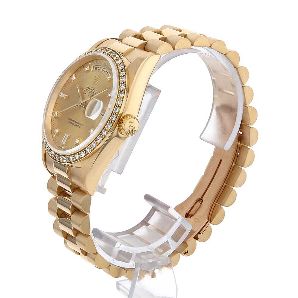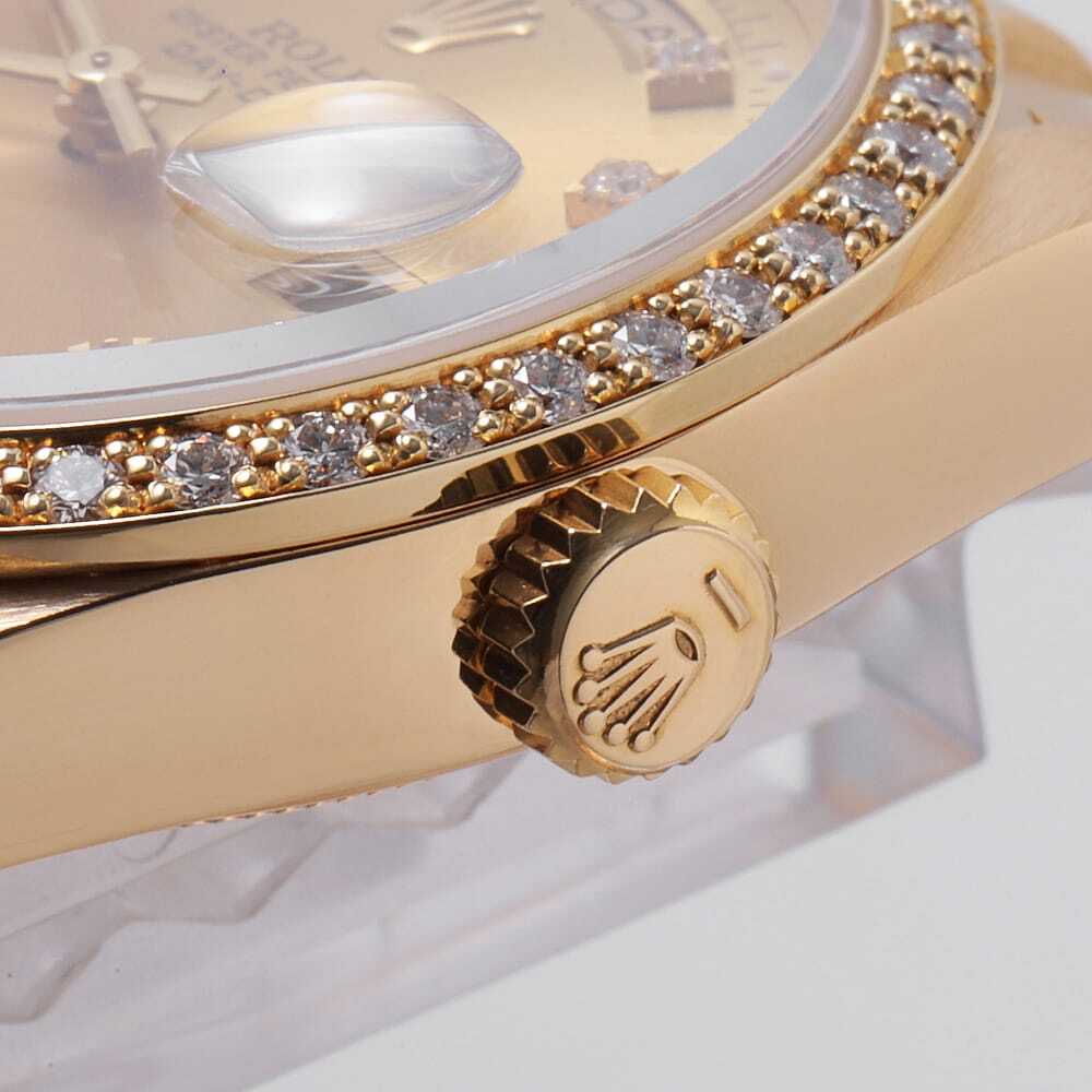 モデル情報 | 1956年の誕生以来、ロレックスの最上級ラインとして最高級の素材と質感にこだわったハイクラスコレクション"デイデイト"。素材はゴールドもしくはプラチナのみを採用しており、唯一フルカレンダーを搭載するモデルです。文字盤のシャンパンゴールドには8Pダイヤ、6時・9時位置にはバゲットダイヤ、さらにはベゼルにもダイヤを装飾した華やかでゴージャスなモデルです。 |