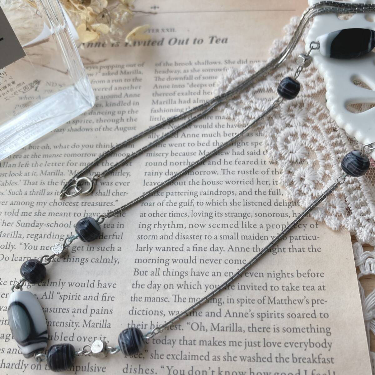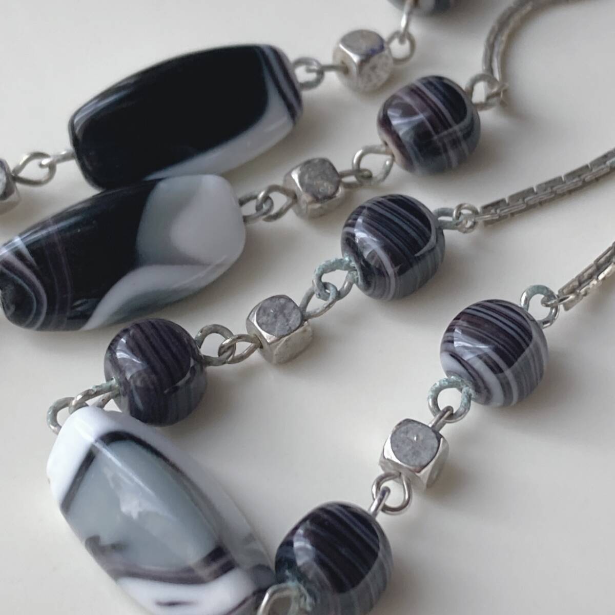 ロングネックレス モノトーン シルバートーン ストーン ブラック 美品☆vintage jewelry accessories F0053