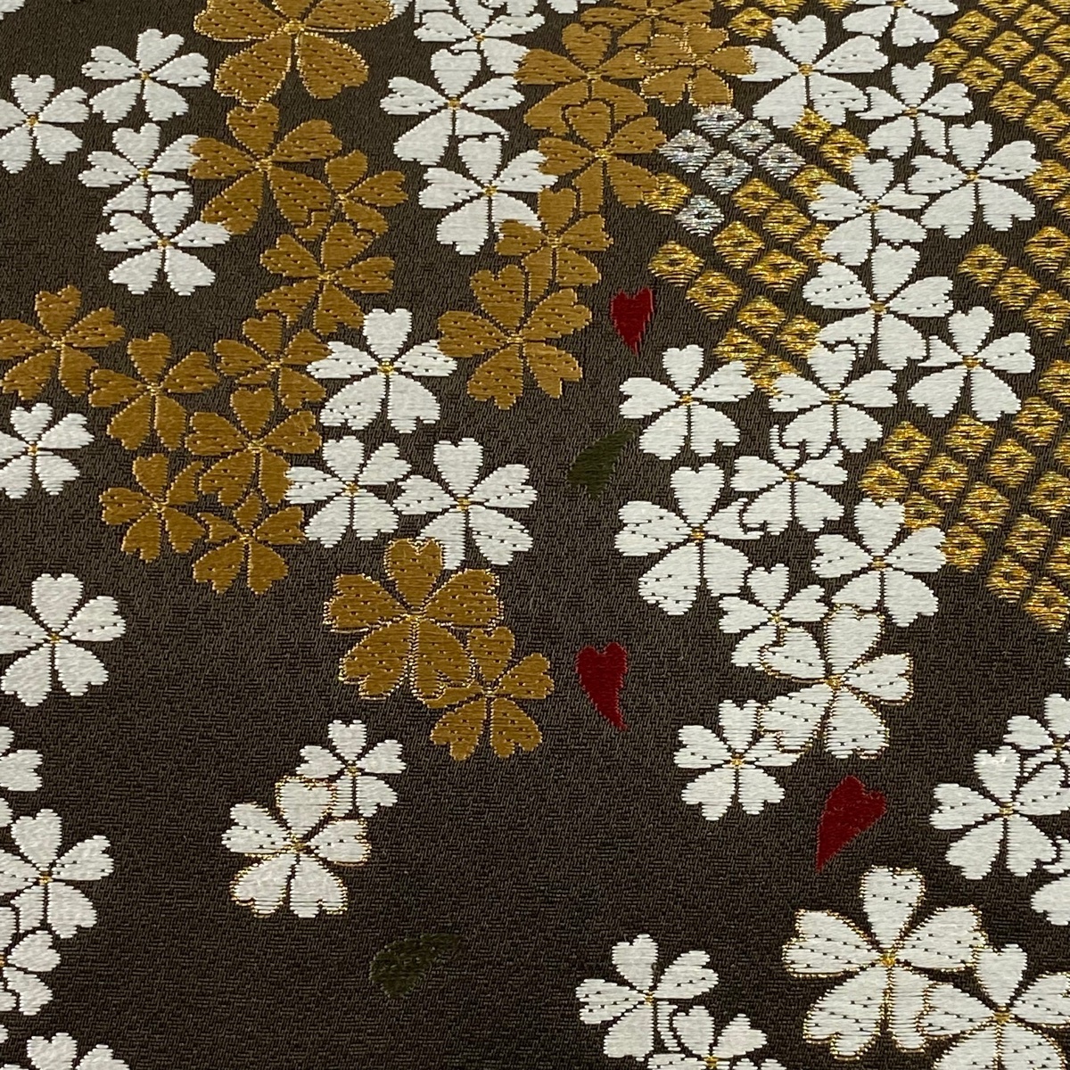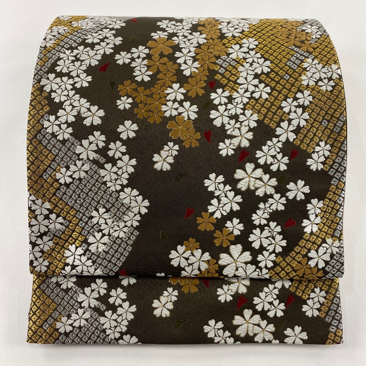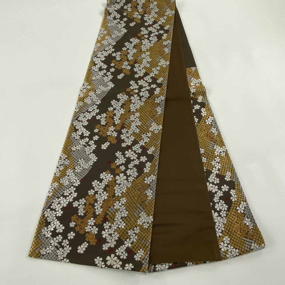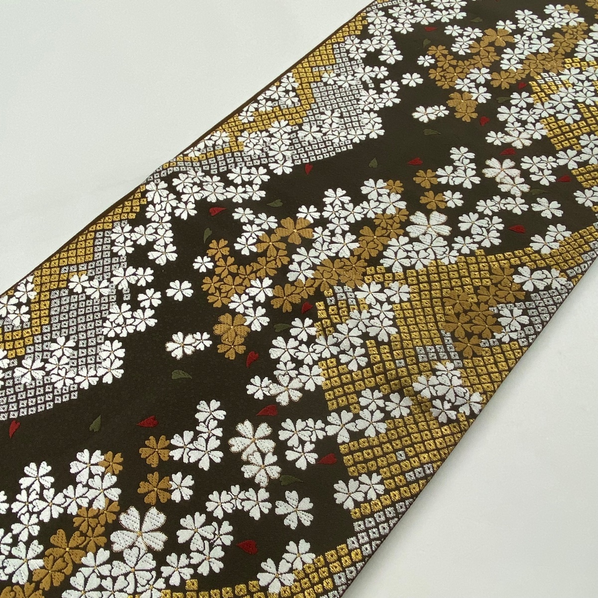 | 袋帯 美品 秀品 桜 疋田柄 刺繍 金銀糸 焦茶色 六通 正絹 【中古】 |
