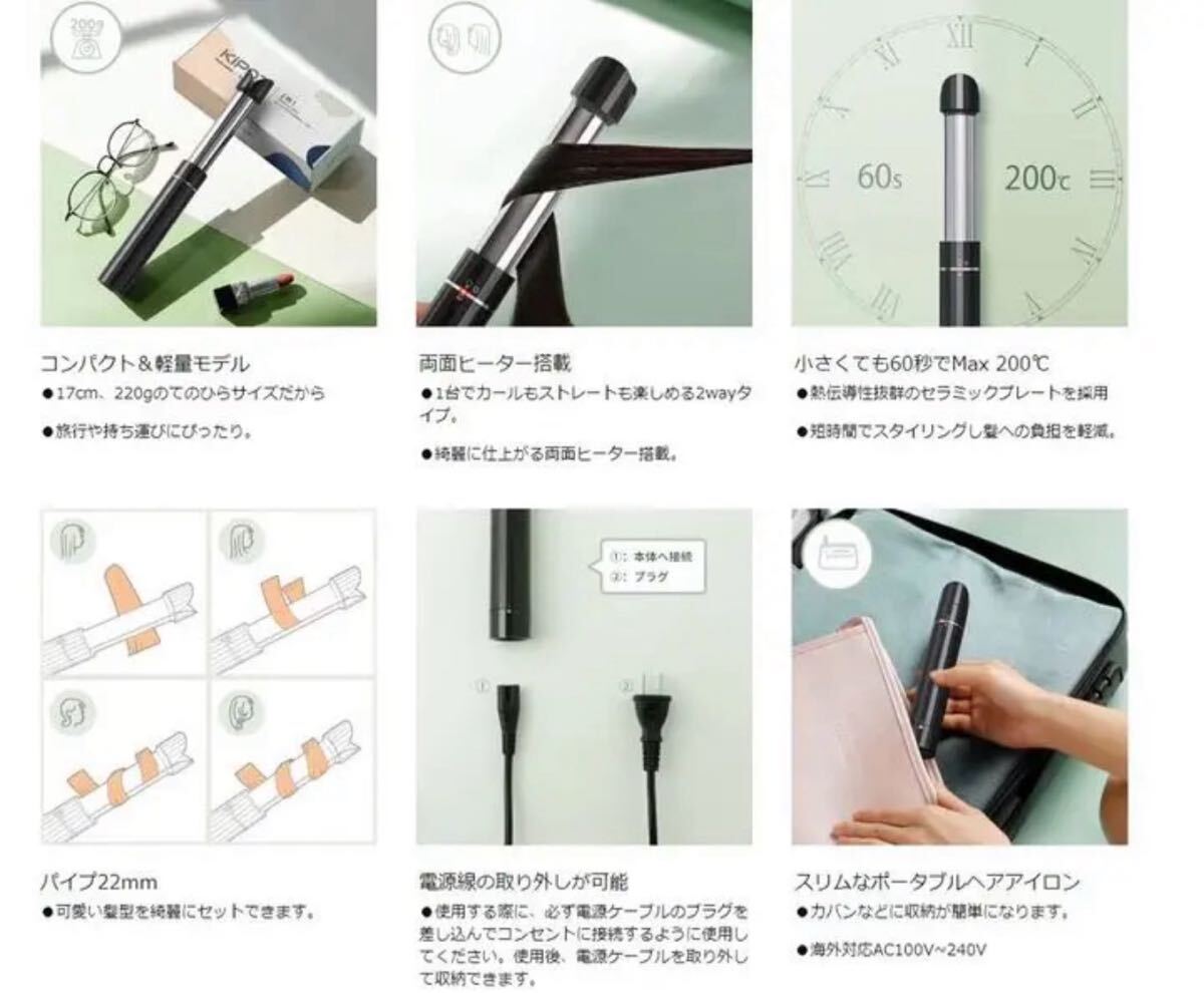 【2in1仕様&男女兼用】ストレートとカール専用を使い分けることが可能な両用ヘアアイロン。ヘアアイロンを閉じると円形になるラウンドヘッドで、ストレートからカールまで2wayなスタイリングにも自由自在。 ショートからミディアム・ボブに好適な人気の22mmバレル 「ゆる巻き」も「波ウェーブ」も美しく仕上がり、ご気分に合わせて髪スタイルの変更が簡単になります。女性らしさのストレートスタイルやゆる巻きも簡単に再現可能。男性のショートヘアや前髪のセットにも最適です。スタイリングが難しいショートヘアでも楽にセットできます。 【急速加熱 & 髪に優しい】短時間で仕上がる熱伝導抜群のセラミックプレートとマイナスイオンを採用し、忙しい朝でも60秒で素早くスタイリング開始、滑りもよい、髪の毛の静電気を減少させ、うるおい効果が得られ、キューティクルを保護しながら、熱による髪へのダメージを軽減してくれ、髪滑りも良く美しい仕上がりになります。熱伝導性の高いセラミックプレートの素材で髪のキューティクルを守り、水分バランスを保つことで、髪への損傷を最小限に抑えることができる。 突破コード根本の構造・コードの形状・検品の強化を行いました。やけどの心配もなく安全にスタイリングすることができ、本体滑り止めができるし安全性を確保しています。ミラーイオンチタニウムプレートで髪へのダメージを最小限にヘアケアしながら潤いとツヤのある美しい仕上がりへ。 ストレートでもカールでもこれ一本で綺麗に様々なスタイルを作り出けます。