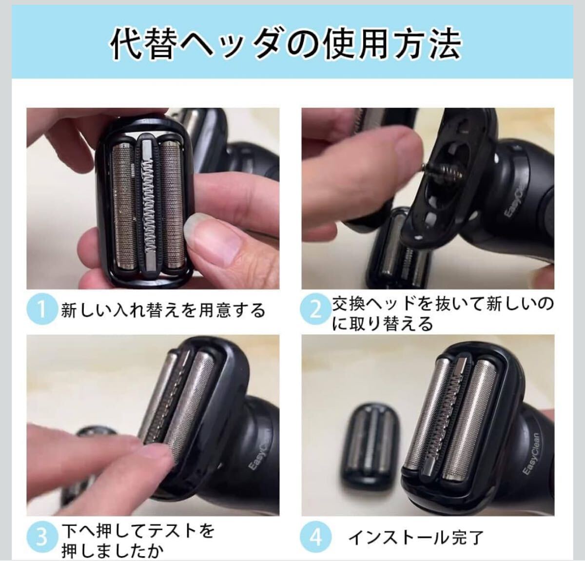 【操作が簡単】替刃を交換するのは非常に簡単です。古いヘッドを取り外し、新しい53B交換用替刃を軽く固定するだけです。これにより、シェーバーは新たに生まれ変わり、より清涼で快適なシェービング体験を提供します。