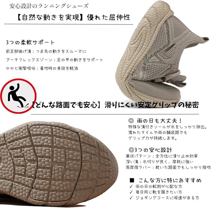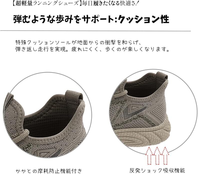 衝撃吸収で足腰に優しい:クッション性の高いソールで、地面からの衝撃を和らげます。ランニングや長時間の歩行でも足腰への負担を軽減。