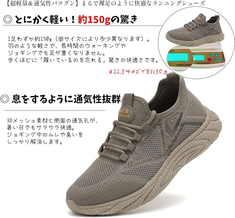 超軽量設計で快適な履き心地:当シューズは1足約150gの超軽量設計!長時間のランニングやウォーキングでも足が疲れず、通勤・通学にも最適です。