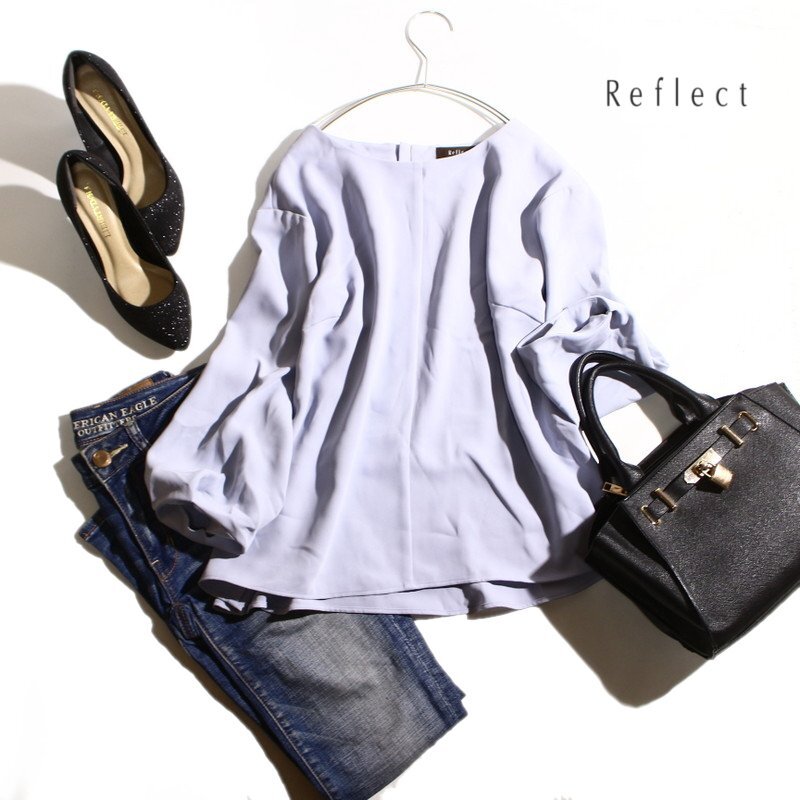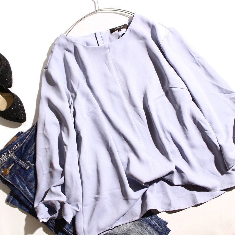 美品 リフレクト Reflect 株) ワールド ジャージ― 淡色 ミセス プルオーバー ブラウス カットソー 水色 11 オフィス 通勤 無地 七分 春 夏