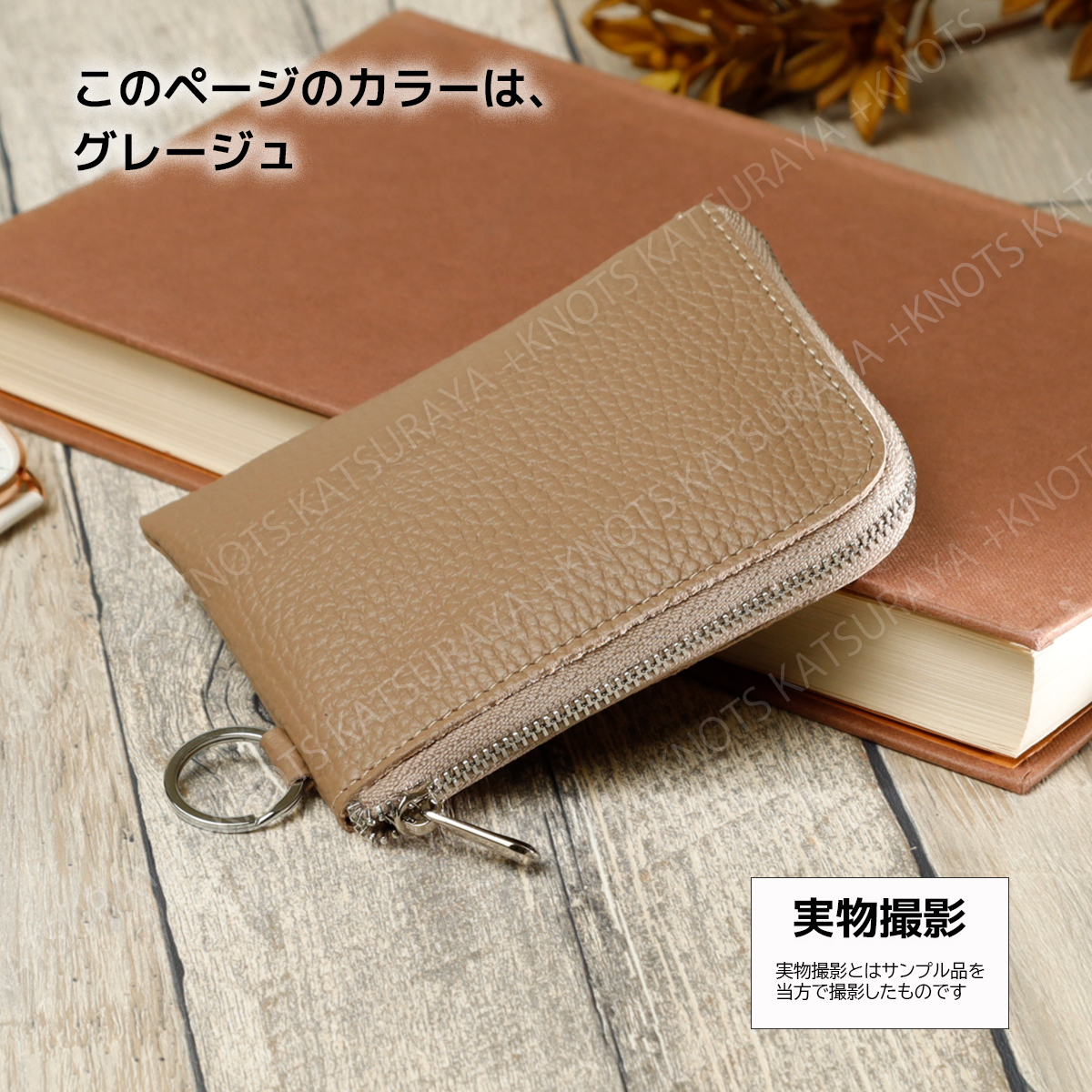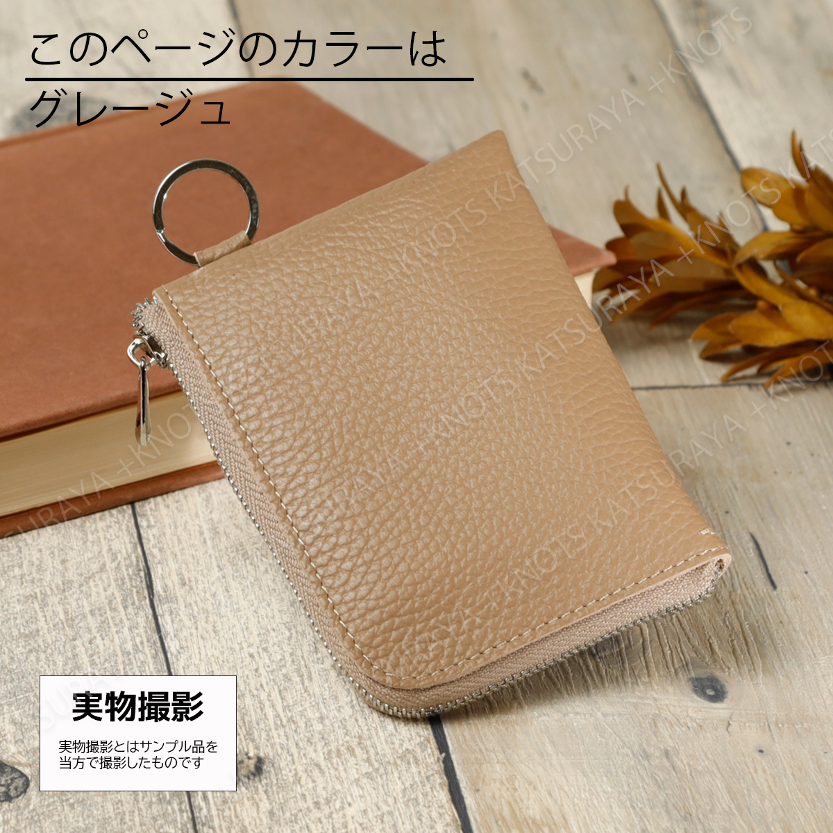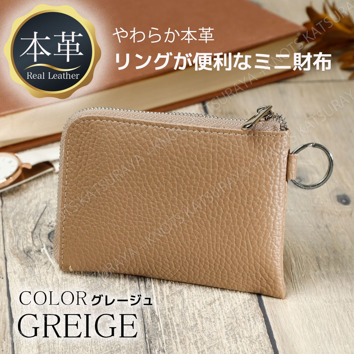 本革 リング付き L字ファスナー ミニ財布★グレージュ★レディース メンズ 柔らかい 小さい コンパクト スリム 薄い 軽い レザーa274