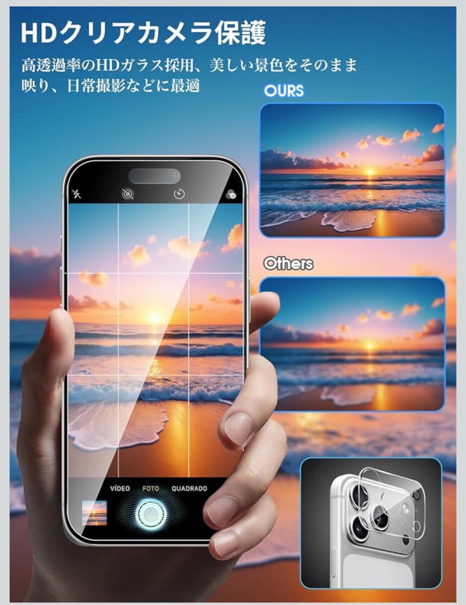 適用機種】iPhone 17 Pro 対応のガラス保護フィルム(2枚)とレンズフィルム(2枚)です。スマホの液晶画面やカメラレンズどちらも保護できます。
