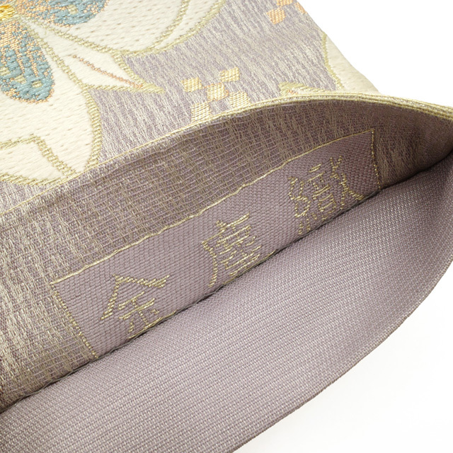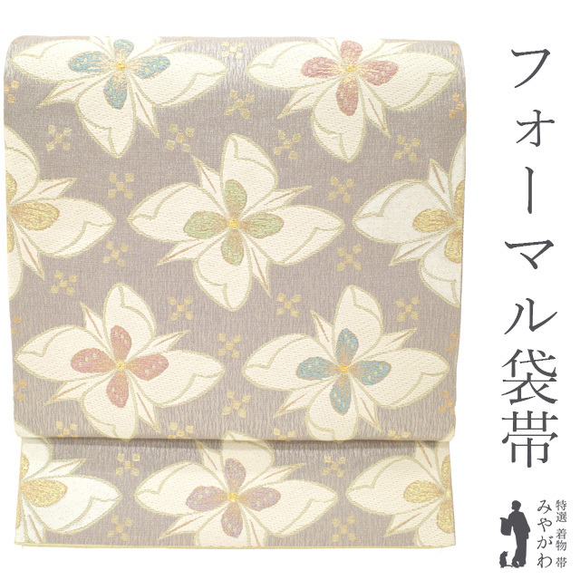 【中古】 袋帯 フォーマル リサイクル 正絹 京都 西陣 宮田織物 金塵織 彩華梅花文 花柄 薄紫地 花 金糸 銀糸 ラメ糸 金塵織 春 秋 冬 仕立て上がり みやがわ sb54441