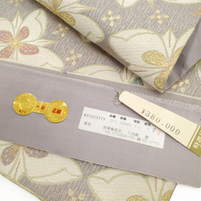 袋帯 フォーマル リサイクル 正絹 西陣 宮田織物 金塵織 彩華梅花文 薄紫地 花 金糸 銀糸 ラメ糸 中古品 仕立て上がり みやがわ sb54441
