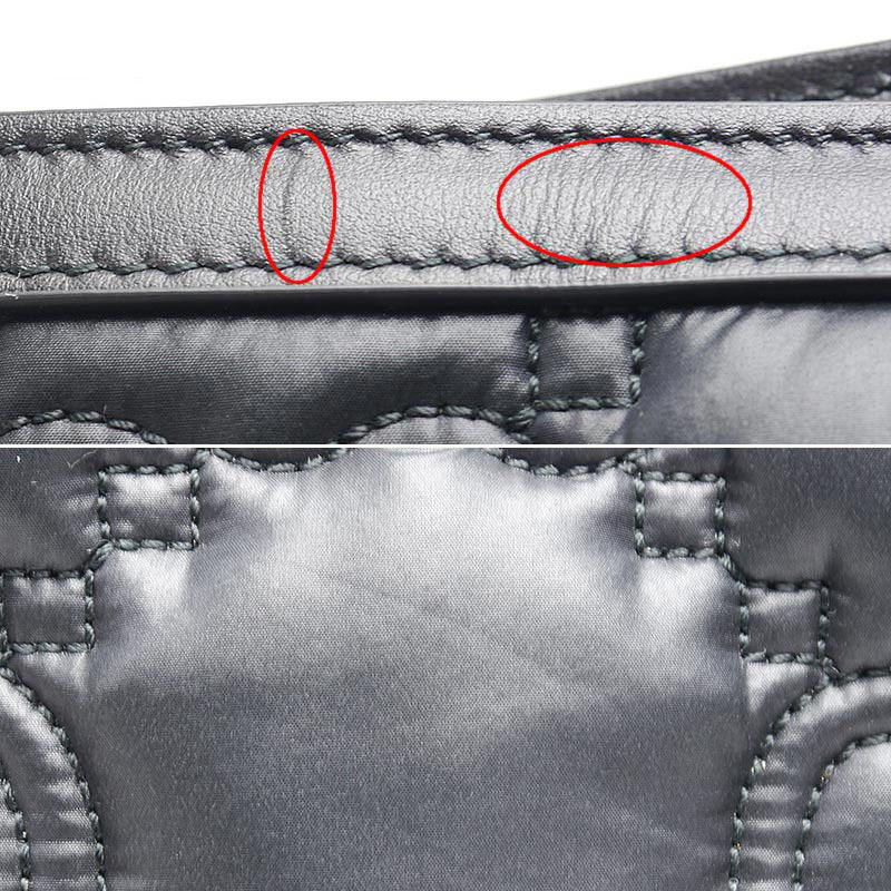 【外側】角のごく僅かなスレ、底部レザーに小さな汚れの付着、開口部レザーに僅かなスレ、ナイロンに押し痕や小さなスレ