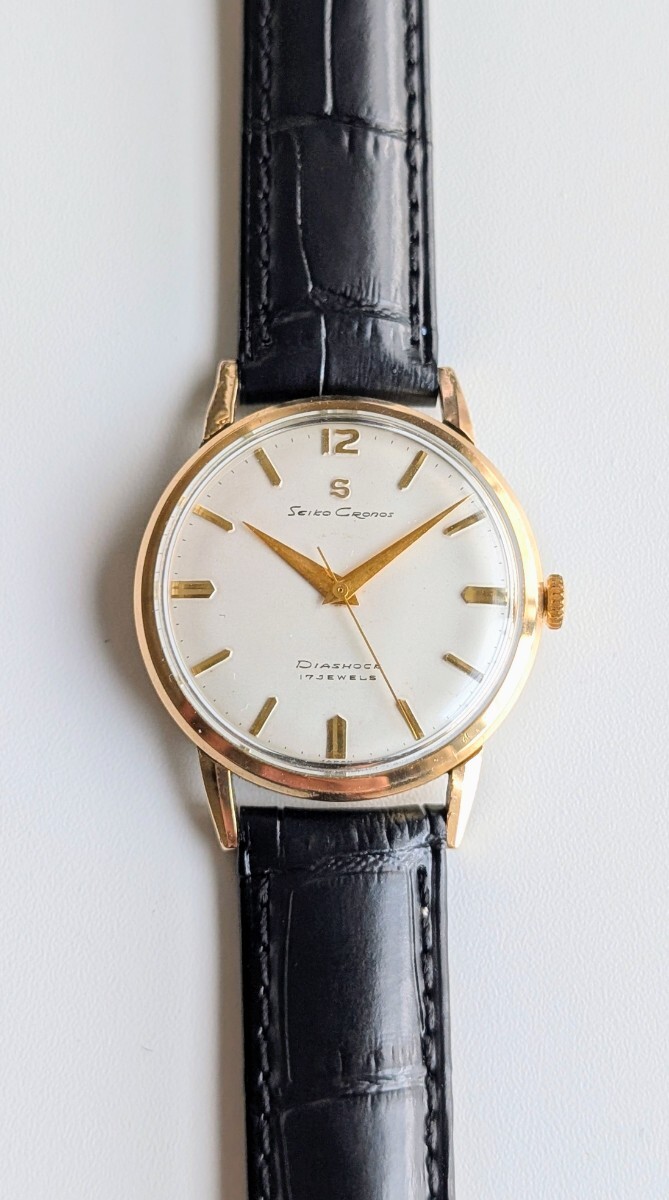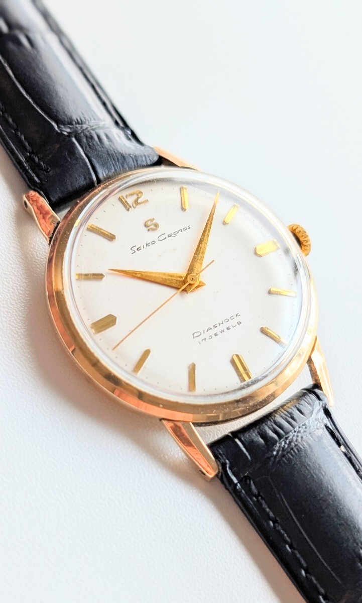 当時、諏訪精工舎(大和工業)のマーベルを意識して製造された第二精工舎 亀戸工場初の男性用中三針モデルとして1958(昭和33)年に発売した「クロノス」。