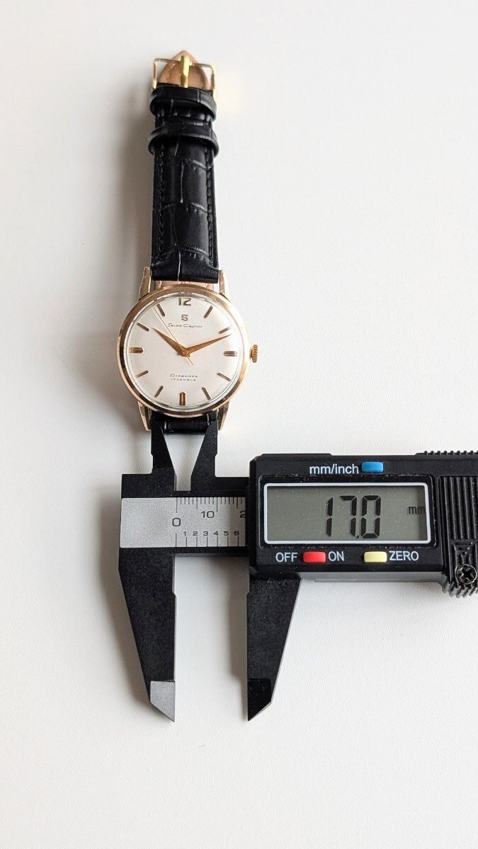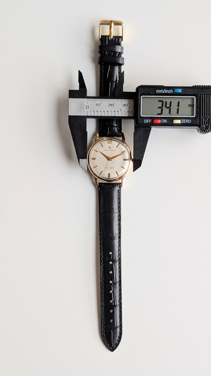 本体ケース径は竜頭を含まず横幅約34.1ミリで腕廻りは新品革ベルトなので標準フリーサイズです。
