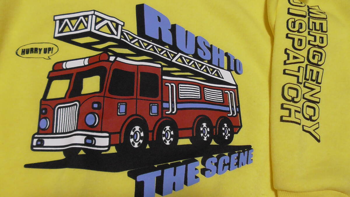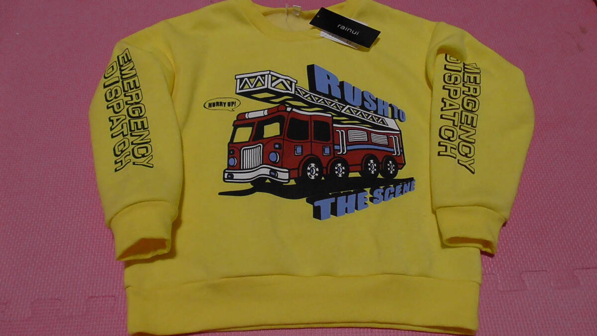 新品 130 働く車柄 長袖トレーナー 黄色 はしご消防車 袖プリント 緊急車両 サイレンカー あったか 裏起毛 男の子 冬物 120cm~ 送料無料