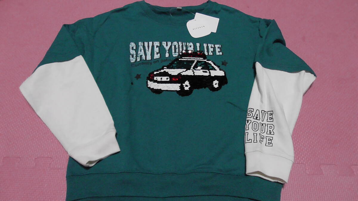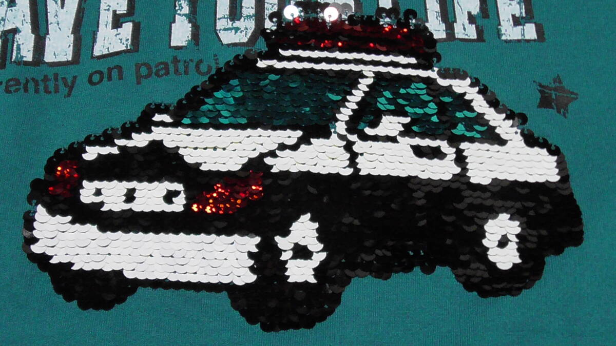 新品 130 パトカー リバーシブルスパンコール 長袖トレーナー グレー レイヤード 重ね着風 警察 黄色 働く車柄 男の子 秋物 120~ 送料無料