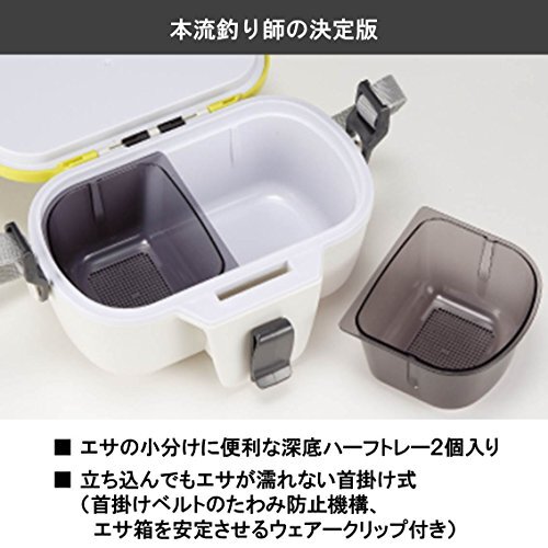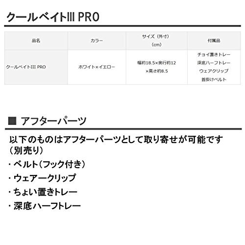 ・ホワイト×イエロー 790604・クールベイト 3 PRO●エサの小分け使用時に便利な「ちょい置き(マット付き)トレー」付き●立ち込んでもエサが濡れない首掛け式(首掛けベルトのたわみ防止機構、エサ箱を安定させるウェアークリップ付き)●エサの小分けに便利な深底ハーフトレイ2個入り本流釣り師の決定版