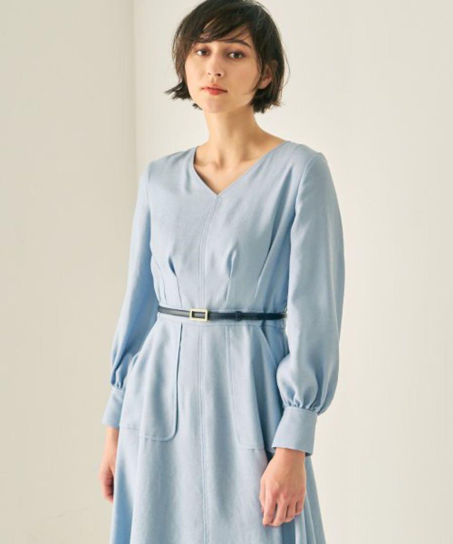 大きめのアウトポケットとパフスリーブがポイントのフレアーワンピース。
