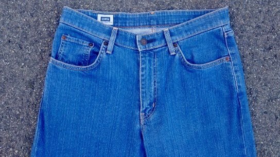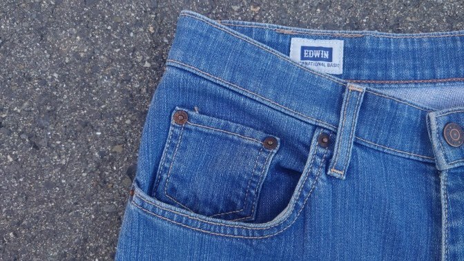 生地の素材・・・・エドウィン特許のストレッチデニム。生地の分厚いデニム生地で少し一般のデニムより柔らかい生地の伸びちじみしても型崩れせずヒッパリ感の無し今流行りのストレッチデニムコットン綿57%×レーヨン40%×ポリウレタン3%。