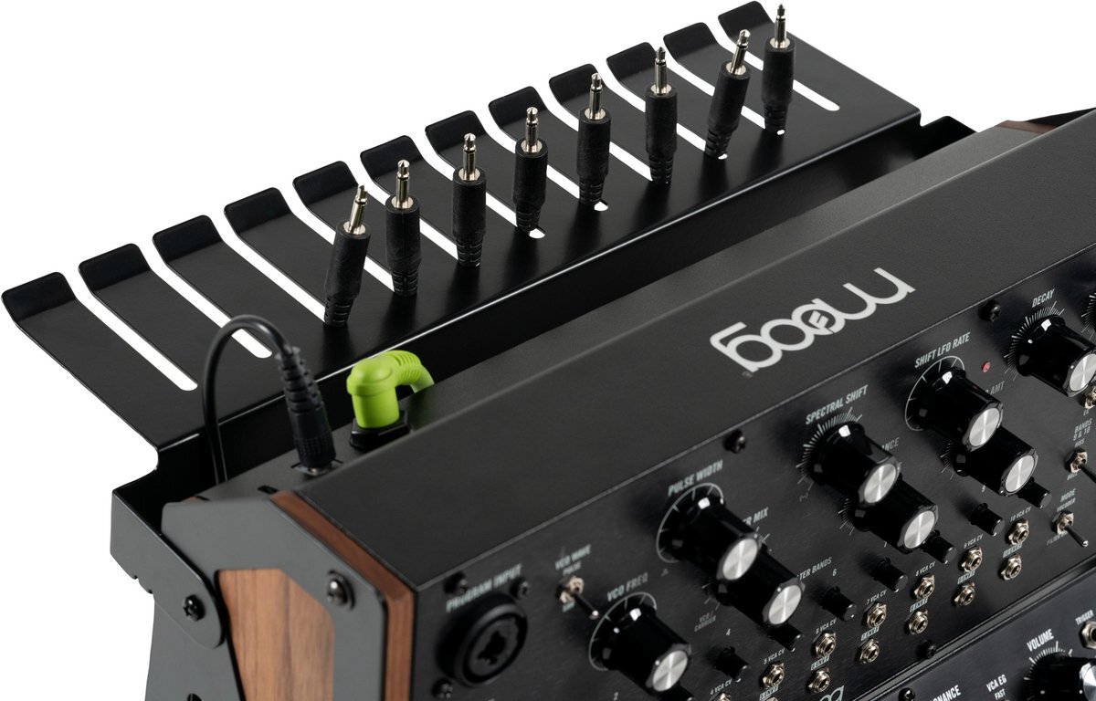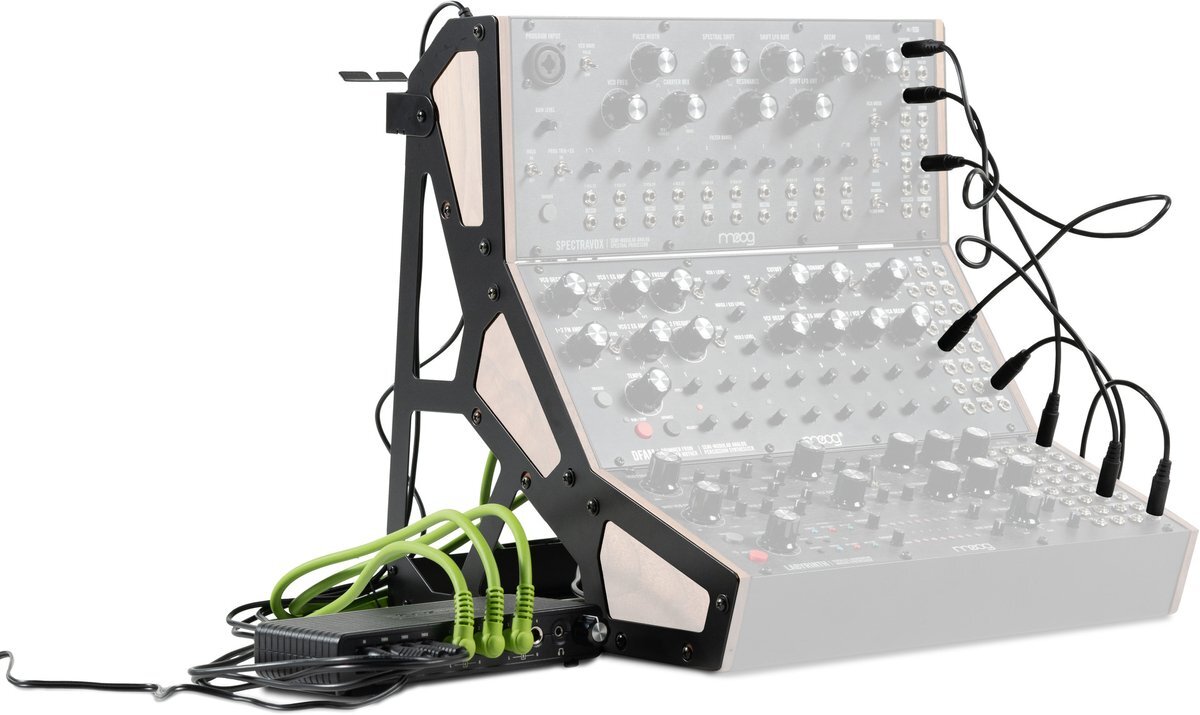 | Moog Sound Studio Accessory Kit 積み重ねる、つなげる、創造する Moog Sound Studio Accessory Kitは、MoogのMotherエコシステムシンセサイザーを最大で3段まで積み重ね可能な、待望のラックシステムです。Mother-32、DFAM、Subharmonicon、Spectravox、Labyrinthのセミモジュラーシンセサイザーを垂直にマウントし、最大限の「モジュラリティ」でシンセシスの可能性を広げます。 Moog Sound Studio Accessory Kitには、コンパクトなサミングミキサーが付属しており、柔軟な信号ルーティングを提供します。また、3口電力供給ハブにより、単一の電源からシステム全体に電力を供給します。さらに、パッチケーブルハンガー、ダストカバー、そしてもちろん各機種を接続するためのケーブル類もすべて付属しています。 同梱物について パーソナル・ステレオ・サミングミキサーおよび楽器用ケーブル この4入力のアナログサミングミキサーは、多彩なルーティングのためにモノラルまたはステレオ構成に切り替えることができ、内蔵の3口電力供給ハブにより、単一の電源から最大3台までの60HP機器に電力を供給します。付属の楽器用ケーブルは、システムに合わせた長さと色で提供され、配線の煩わしさを軽減します。内蔵のレベルコントロールを備えた3.5 mm出力は、ヘッドフォン、オーディオインターフェイス、またはモニタースピーカーへの接続を可能にします。 3段ラックキット 3台のシンセサイザーをすべて積み重ね、サミングミキサーによってシステム全体を一つに統合することで、スタジオスペースを最大限に利用できます。垂直に積み重ねられることで最適な相互接続性を得られます。安定性とデザイン性を兼ね備えたラックは、省スペース化だけでなく、すべてのコントロールとパッチポイントに簡単にアクセスできる人間工学に基づいたセットアップを提供します。 保護用ダストカバー 使用していないときに、あなたの楽器を守ります。この耐水性のカバーは丈夫なCordura Ballistic製となっており、粉塵、水しぶき、その他スタジオやステージの事故から機材を保護します。パッチケーブルや背面の入出力パネルへのアクセスに余裕のあるフィット感を提供します。調節可能なベルクロストラップにより、カバーがしっかりとフィットして固定されます。 ケーブルハンガーとカスタム・パッチ・ケーブル 付属のケーブルハンガーを3段ラックに取り付けることで、パッチケーブルを整然と収納し、ストレスフリーなワークフローを実現します。パッチケーブルのカスタムセットは、システムの「パッチビリティ」を最大限に活用できるように厳選された長さと本数が付属しています。 MOTHER MIXER(前面) 入力:6.3 mm TS入力端子×4 出力:3.5 mm TRS出力端子 電源仕様:電源アダプター接続、3つの電源スルー接続端子 MOTHER MIXER(背面) オーディオ:3+4モノラル/Bステレオスイッチ、1+2モノラル/Aステレオスイッチ 電源アダプター(付属) 仕様:壁コンセント; バレル接続;センタープラス 電源入力:100~240 V~50/60 Hz最大1.5 A 電源出力:12.0V-3.0A,36.0W 同梱物 ・電源アダプター ・4チャンネルMother Summing Mixer/パワーディストリビューター ・3段ラックシステムおよび組み立て用工具一式 ・3.5 mm TSパッチケーブル(長さ約30 cm)×4 ・3.5 mm TSパッチケーブル(長さ約45 cm)×4 ・オーディオケーブル(長さ約45 cm)×3 ・バレルtoバレルDCコネクター×3 ・プラスドライバー ・ダストカバー ・クイックスタートガイド ・安全および保証マニュアル 重量&外形寸法(製品のみ) 重量(kg):1.95 kg センチメートル(cm):35.05 W×37.49 D×6.4 H cm |