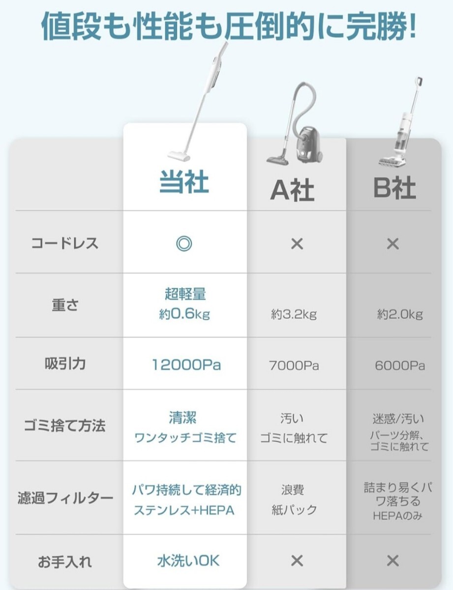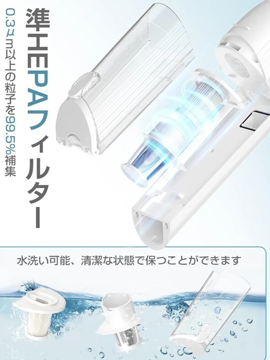 【15000pa強力吸引多層濾過お手入れ簡単】掃除機は120W最上クラスのブラシレスモーターを採用して、最大15000Paの吸引力をサポートし、フローリングの溝の吸引力は従来の5倍と、デスクの埃やゴミはもちろん、カーペットに入り込んだ砂や土などもしっかり吸い取れます。片手で使えて、全部屋は1台で掃除できます。また、フィルターやヘッドブラシは水洗いが可能なので、コードレスクリーナーを清潔に使えます。HEPAフィルターが2つ入ってるので、洗って乾くまで待たなくてもすぐにご利用できます。標準モード:吸引力約12000Pa 強力モード:吸引力約15000Pa
