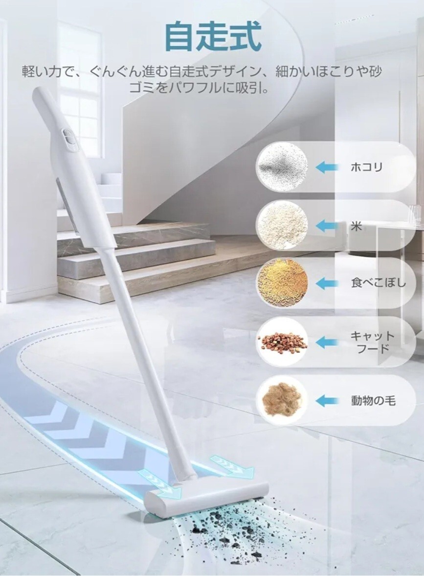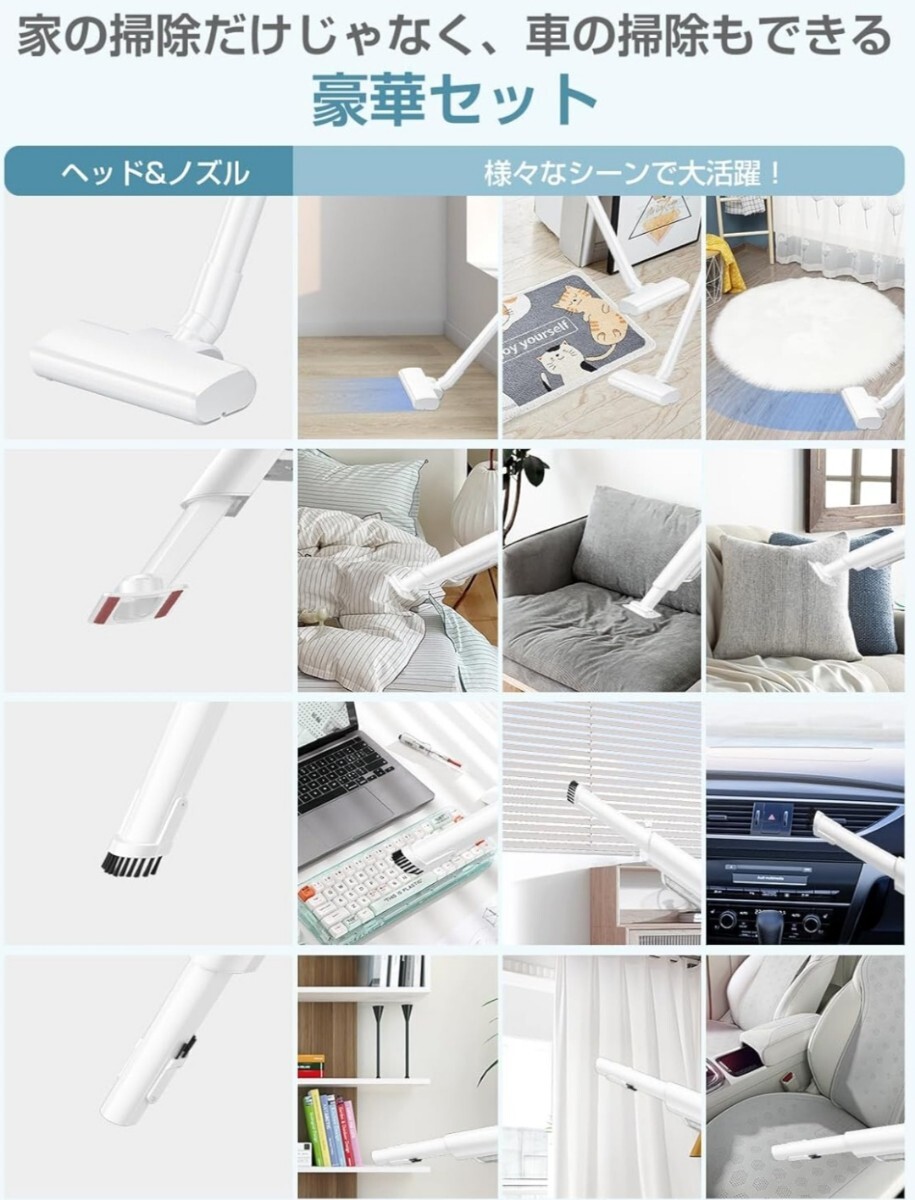 【軽量多目的ノズル付き】そうじきは超軽量、加えてヘッドに自走機能が搭載されていることもあり、軽い力でグングン進む自走式デザイン、細かいほこりや砂ゴミをパワフルに吸引。より軽い力で掃除可能。ライト付き、ほこりが見やすく、暗い場所のゴミも逃さない。ハンディ掃除機は片手で持ち運びができます。人間工学に基づくハンドルデザインと手元に置いた重心により、女性でも持ち上げやすく、エアコンや網戸など高い場所にも簡単に届きます。3種類のノズルが付属しており、布団やソファーなどのファブリックはもちろん、車内など、さまざまなシーンで使えます。細かい隙間にまでしっかり掃除することができ、心地よい掃除が実現します。