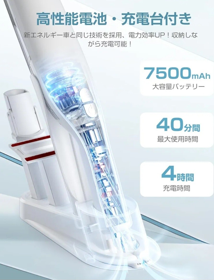 【2種吸引モード切替最長40分稼働】コードレス掃除機は吸引力と駆動時間が最適化された「エコモード」と、よりパワフルな吸引力が必要なときに便利な「強力モード」を搭載しております。掃除中トリガーを押さえ続けることは不要、強力掃除機の吸引モードもワンタッチで簡単に切り替えます。7500mAhの大容量バッテリーが内蔵され、使用時間はエコモードで最長40分と、強力モードで最長20分間連続稼働が可能です。一人暮らしのお家から一戸建てまでどんなご家庭でも活躍します。