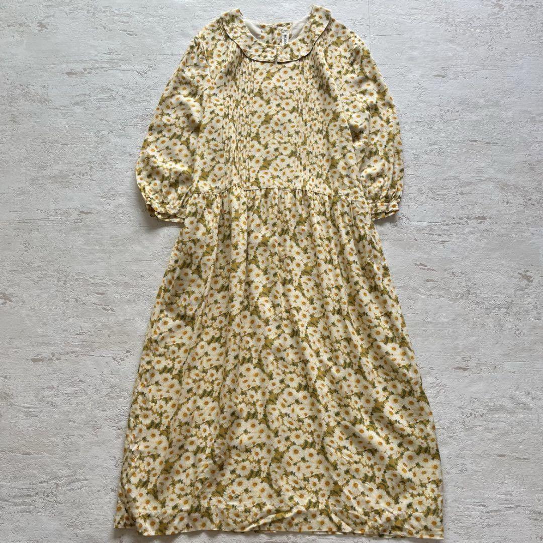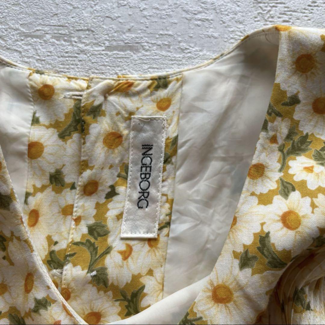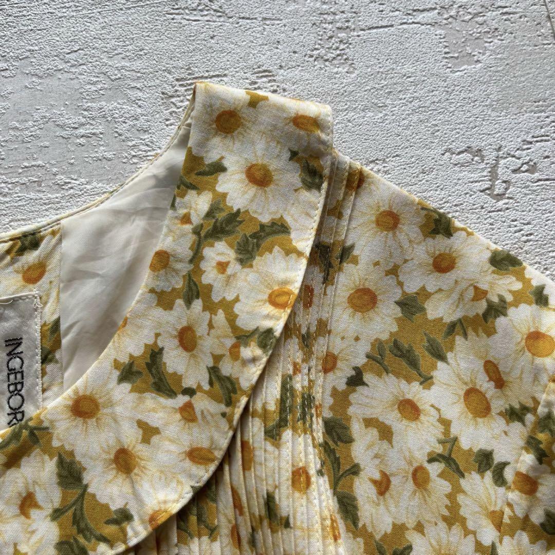 インゲボルグ(INGEBORG)のデイジー柄ワンピースです。全体に広がる小花柄が華やかで、クラシカルな雰囲気を演出してくれる一枚。ゆったりとしたシルエットにロング丈で、上品さとリラックス感を兼ね備えています。襟元のデザインも可愛らしく、ナチュラルでフェミニンな印象。春夏は一枚で爽やかに、秋冬はカーディガンやジャケットを羽織ってコーディネート可能。お出かけやお呼ばれ、デイリーにも活躍できる万能アイテムです。目立ったダメージはなく、まだまだ長くご愛用いただけます。人気のデイジーモチーフでお探しの方におすすめです。