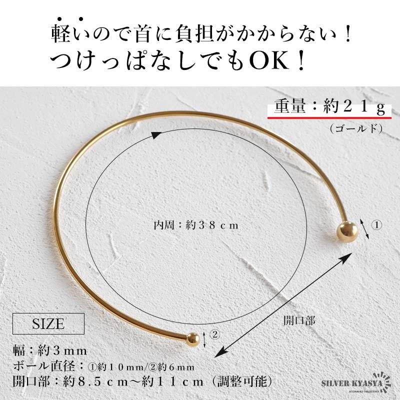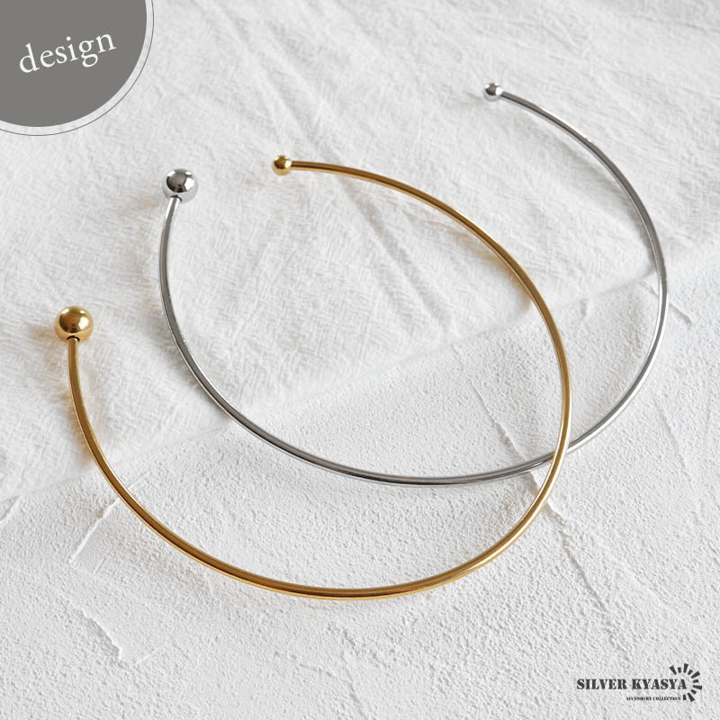 シンプルなプレーンデザインのメタルチョーカー。開口部のボールがさり気ないワンポイントです。素材はあんしんのステンレス素材なのでつけっぱなしでもOK。夏はTシャツ、冬はニットなど1年中使えるマストアイテムです。