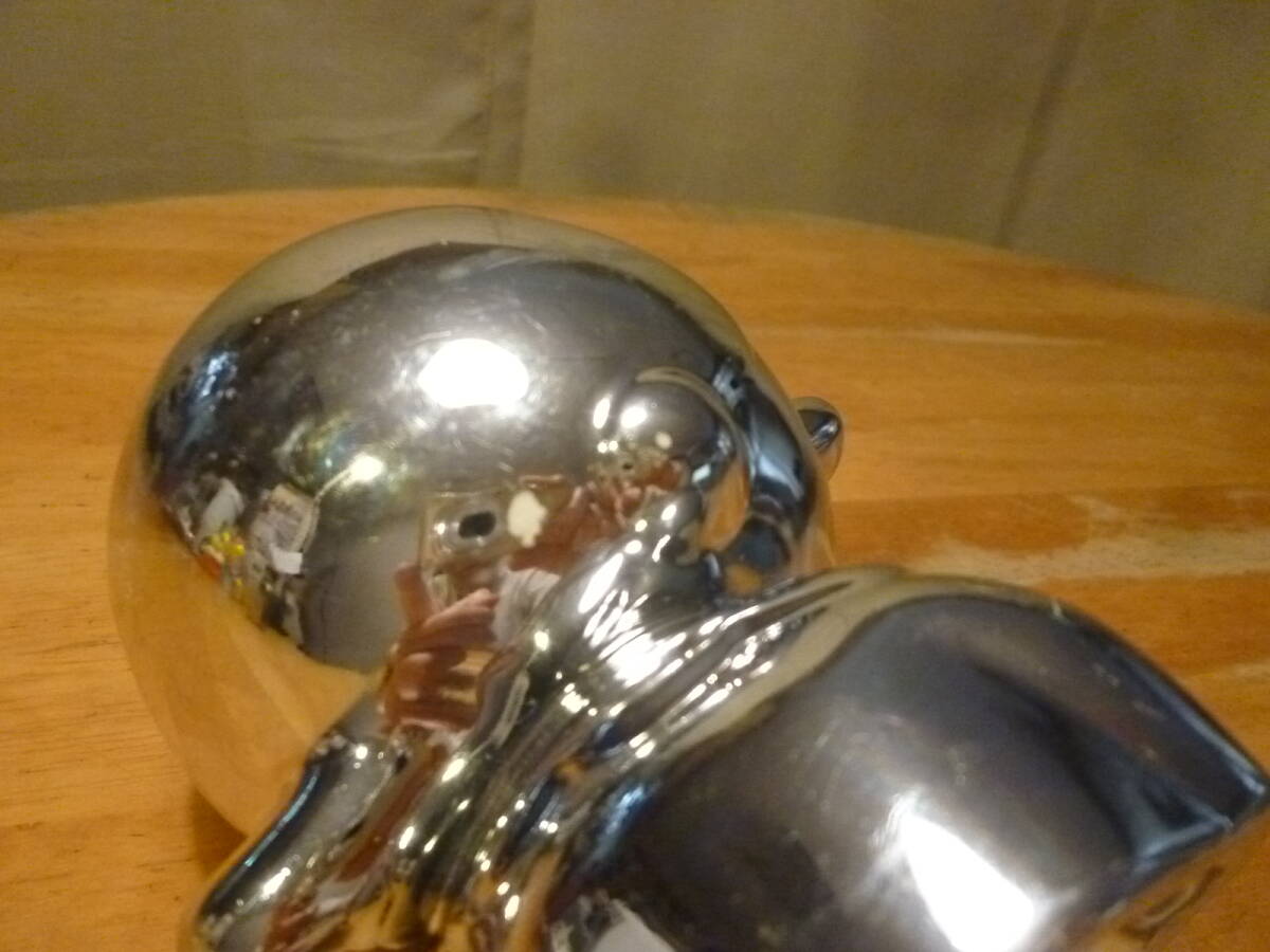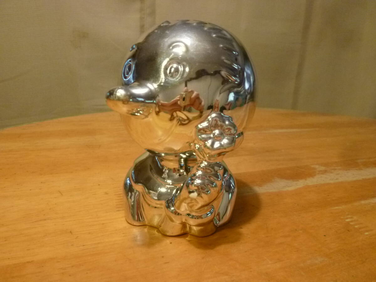 こちらはシルバー塗装の樹脂製と思われるオリーブの貯金箱の様です。少し重さも感じ、特長ある髪型を後ろでチョコンと結び、鼻は高くポパイからのプレゼント?の花束を両手で握りうれしそうです。